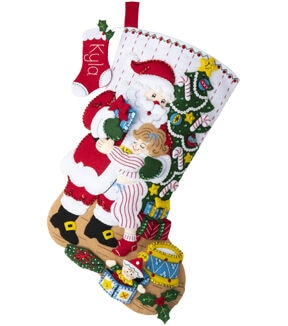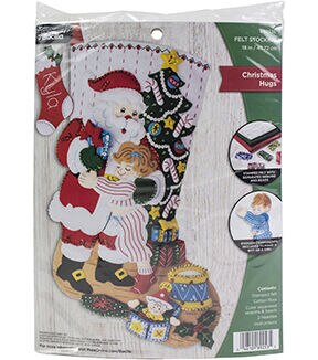 Festive designs, quality materials and generous embellishments continue to make Bucilla felt kits a favorite stitchery tradition. This package contains stamped felts, cotton floss, color separated sequins and beads, two needles and instructions. Design: Christmas Hugs. Finished dimensions: 18 inches long. Made in USA.