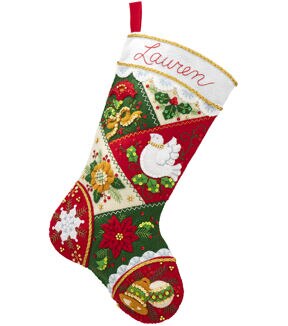 Festive designs, quality materials, and generous embellishments continue to make Bucilla felt stockings a favorite stitchery tradition. The kit includes everything needed to create a felt applique stocking for Christmas and your holiday home decor. This package contains stamped felts, cotton floss, color-separated sequins & beads, needles, and instructions. Design: Elegant Patchwork. Finished Size: 18 inches. Made in the USA.