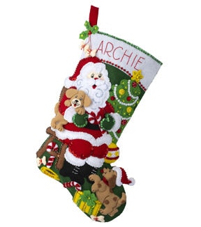 Man's best friend is a beloved gift and delightful keepsake for years to come! Bucilla felt Christmas Stocking kits will help you make your craft project into a cherished family heirloom. Bucilla has been the number one crafter's choice in needle crafts and felt stocking kits for over 150 years. This package contains stamped felts, cotton floss, embellishments, needles and instructions. Design: Jolly Pups Santa. Finished dimensions: 18 inches long. Made in USA.