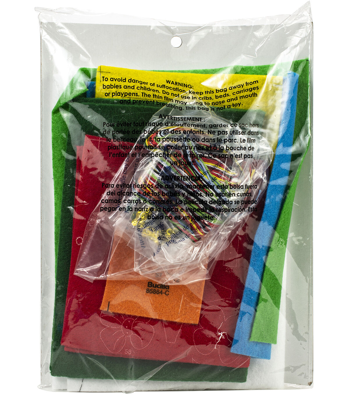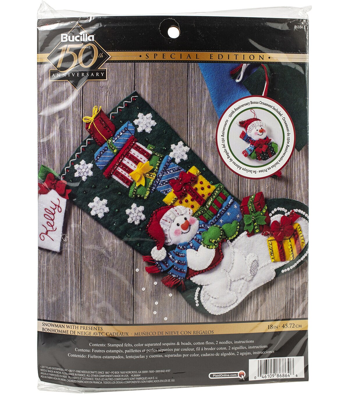 Festive designs, quality materials and generous embellishments continue to make Bucilla felt kits a favorite stitchery tradition. This package contains stamped felts, cotton floss, color separated sequins and beads, two needles and instructions. Design: Snowman With Presents. Finished dimensions: 18 inches long. Made in USA.