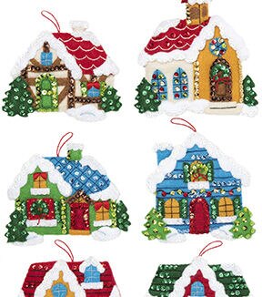 Adorn your tree with this set of wintery ornaments. This colorful kit of snow flocked houses will add a personal touch to your tree that your family will love. Create a sentimental piece you and your family will hold dear for holidays to come. Makes six ornaments. This package contains stamped felt, cotton embroidery floss, color-separated sequins and beads, two needles, and instructions. Design: Christmas Village. Finished dimensions: six 5x4.5 inch ornaments. Made in USA.