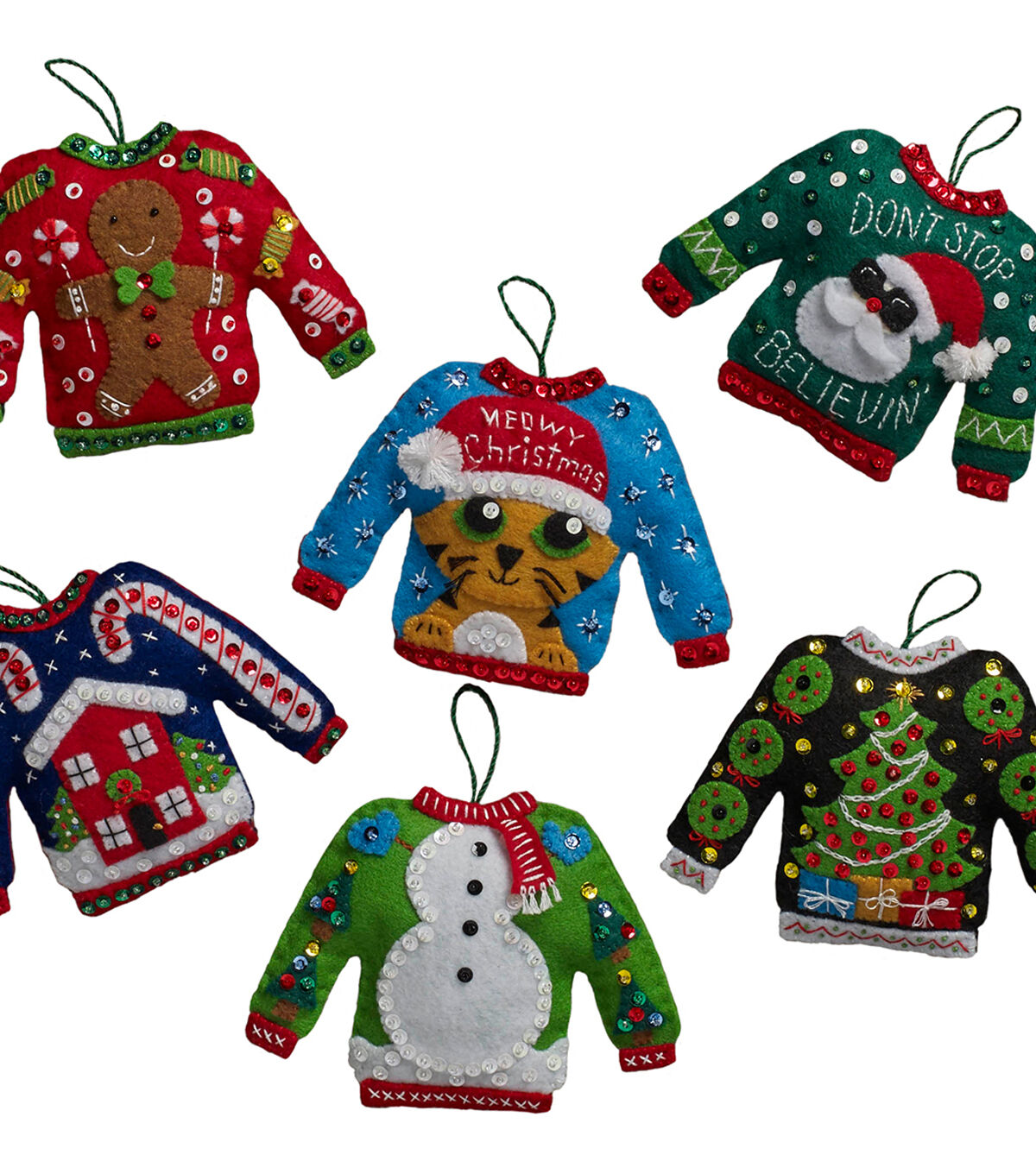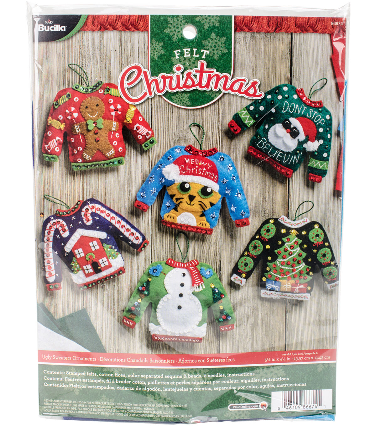 Bucilla-Felt Applique Kit. Festive designs, quality materials and generous embellishments continue to make Bucilla felt kits a favorite stitchery tradition. Makes six ornaments. This package contains stamped felts, cotton floss, color separated sequins and beads, two needles and instructions. Design: Ugly Sweater Ornaments. Finished dimensions: Six 4-1/2x5-1/2 inch ornaments. Made in USA.