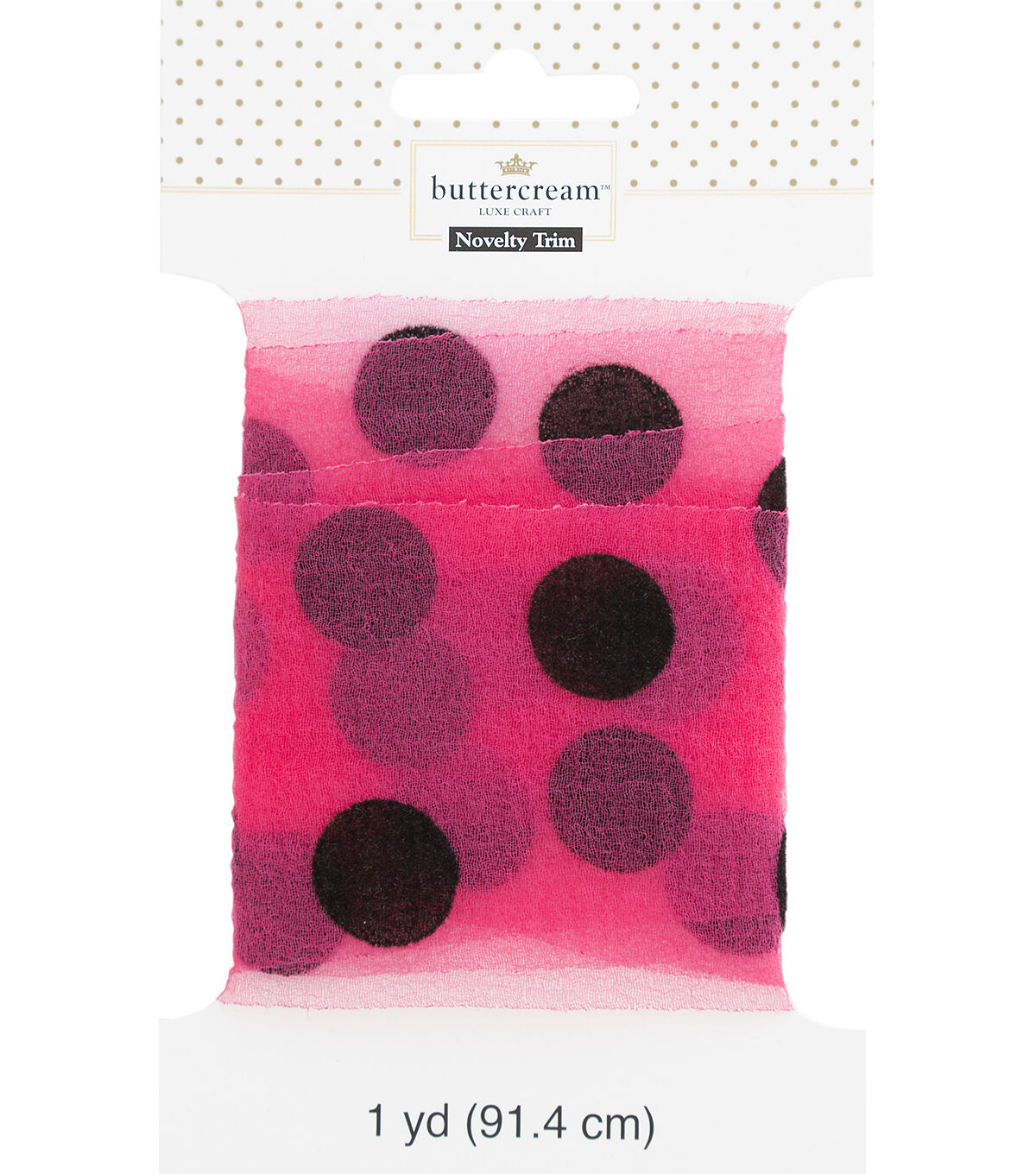 Finish your sewing and fabric projects in style using the Buttercream Luxe Craft Organza Trim-Black Flocked Dots on Pink. You can use it to create visual contrast in your apparel, fashion accessories or other fabric projects.