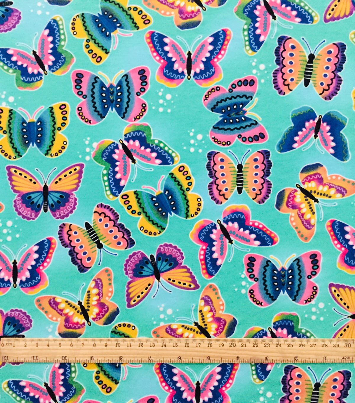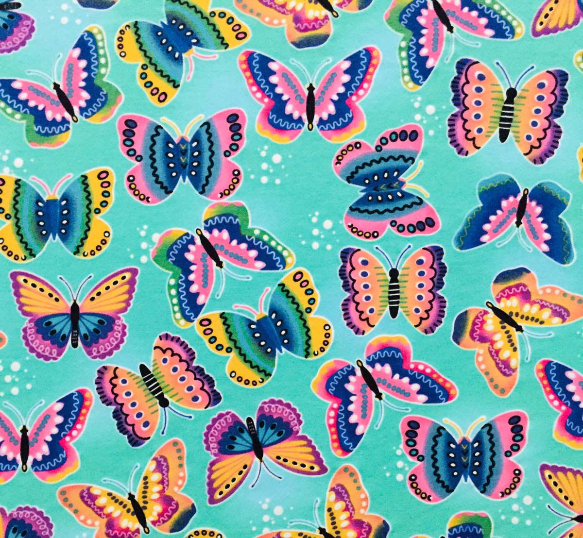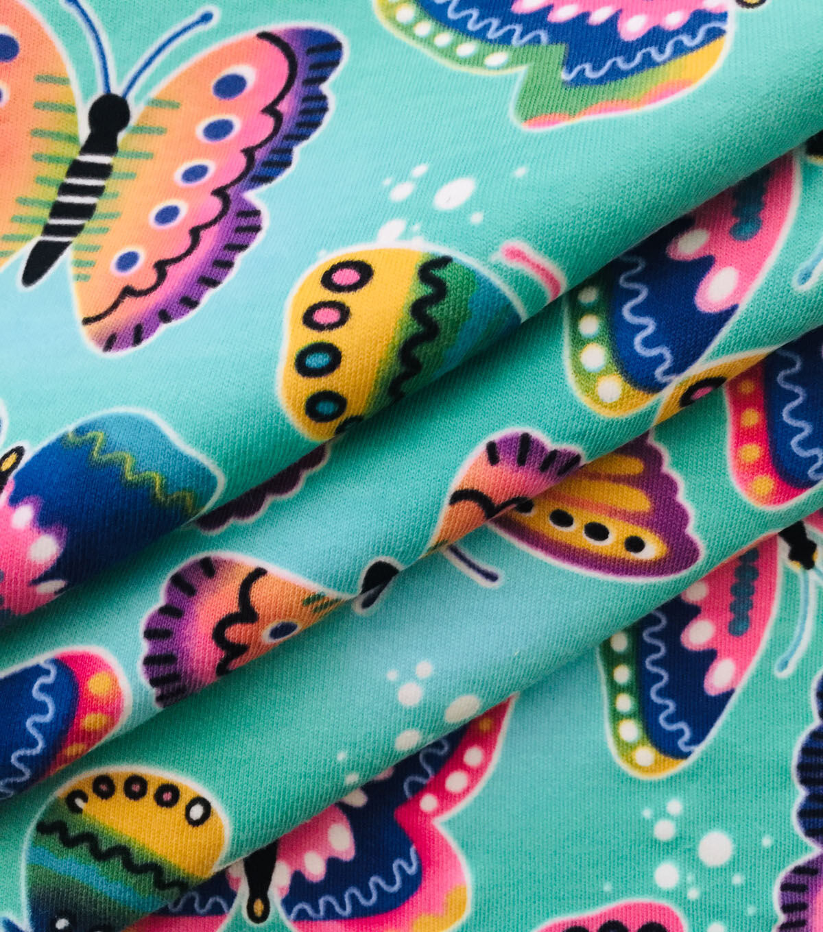 • Butterflies on Teal Cotton Interlock Knit Fabric by POP!