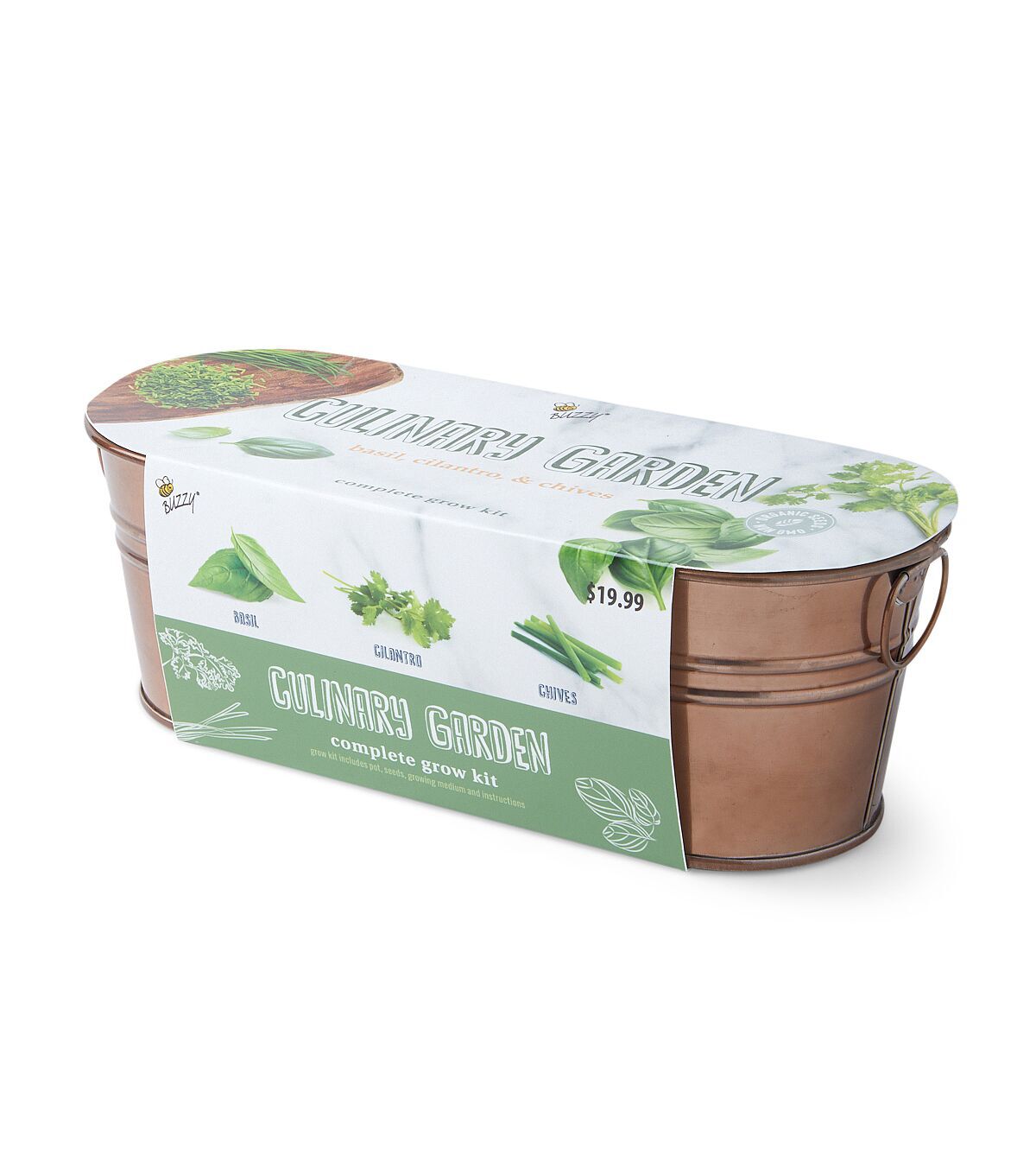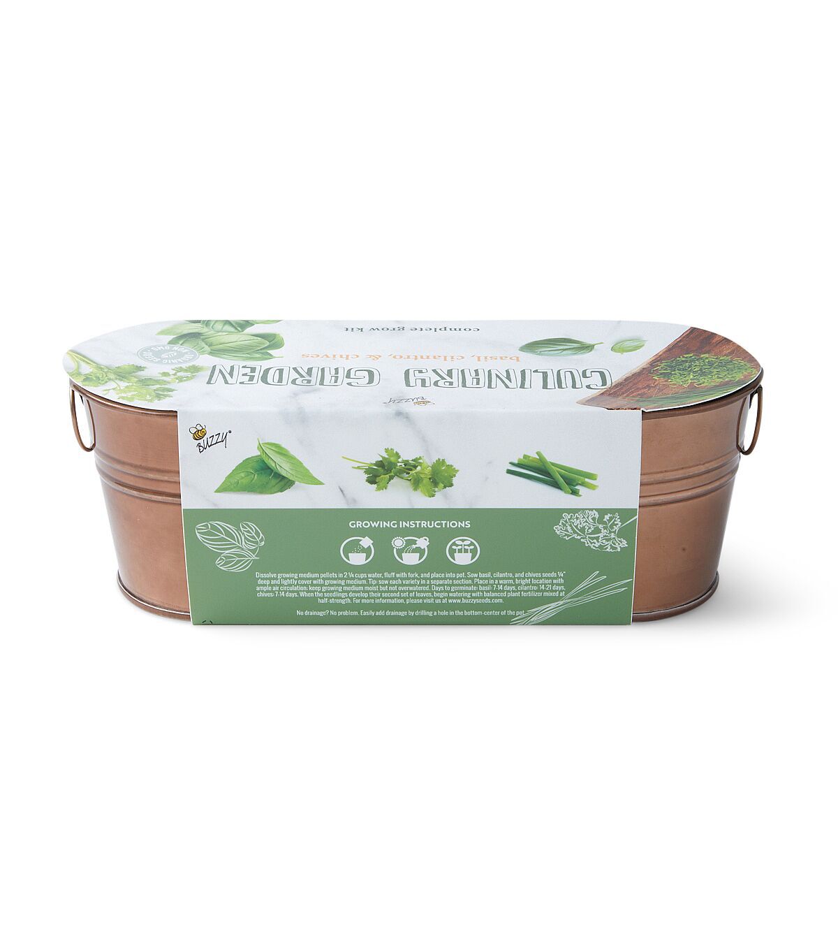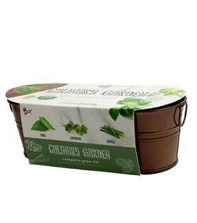 Bring the charm indoors with the Buzzy Windowsill Culinary Herb Garden Grow Kit. Fun and super easy to use, each kit includes everything you need to grow fresh basil, cilantro and chives the easy way! Just add water and watch the 100% natural growing medium pellets expand, ready for planting. Plant fearlessly with our Guaranteed to Grow promise. Your seeds will sprout, or we'll replace them for free. Kit includes decorative metal container, growing medium, 3 seed packets, recipes and instructions.
