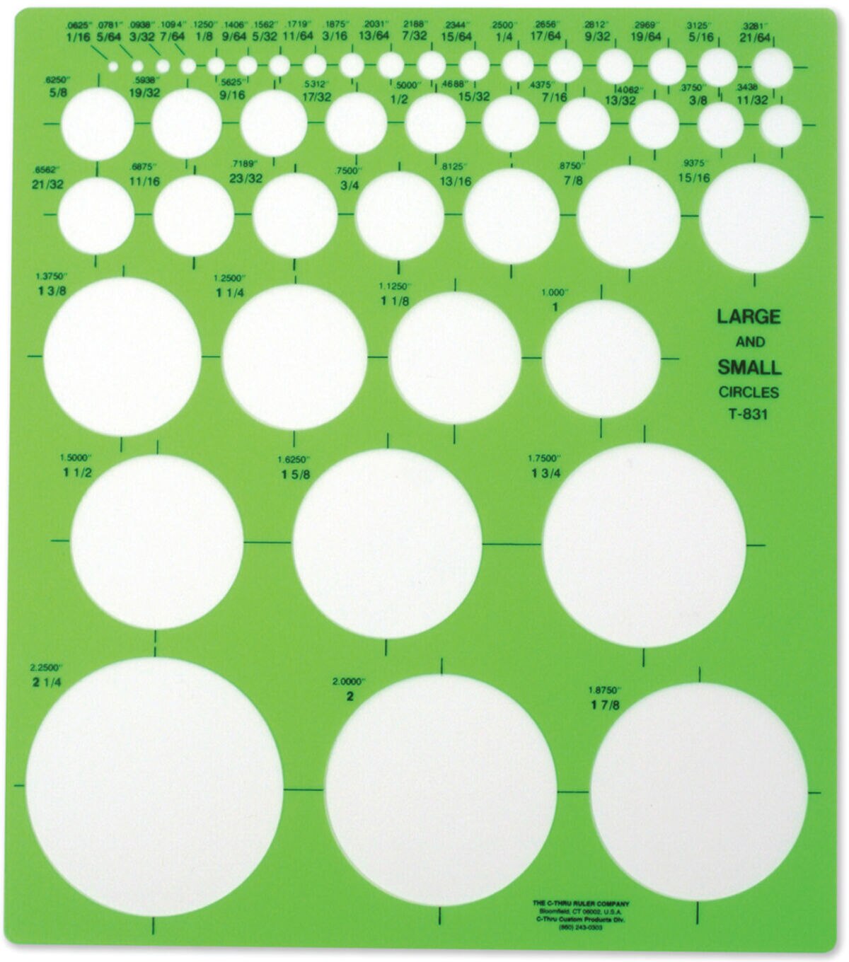 This template is labeled in decimal and fractional measurements, 45 circles ranging from 1/16" to 1-7/8" in diameter. Ideal for drafting, designing and drawing.