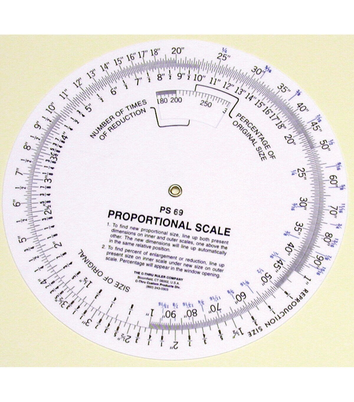This scale is ideal for calculating enlargements or reductions of photographs, artwork and layouts. Simply line up the size of your original with the intended size for reproduction. It provides number of times of reduction as well as percentage of enlargement, enabling you to move forward with a variety of projects without the hassle of trial and error. The scale consists of two circular discs.