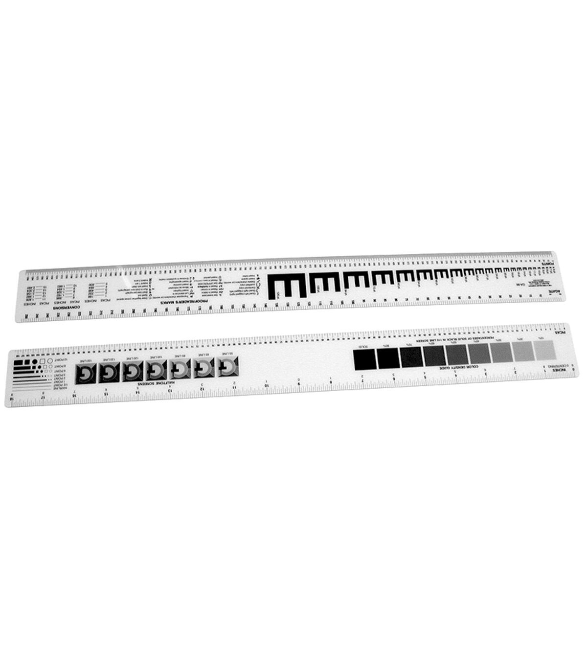 This professional quality 18" ruler features an engineering scale as well as inches, picas and agate calibrations. This dynamic ruler also includes proofreading symbols, printer' s rulers, screen density guides, copy casting system and typewriter copy counters. Cover all of your bases with this all-in-one graphic arts ruler!