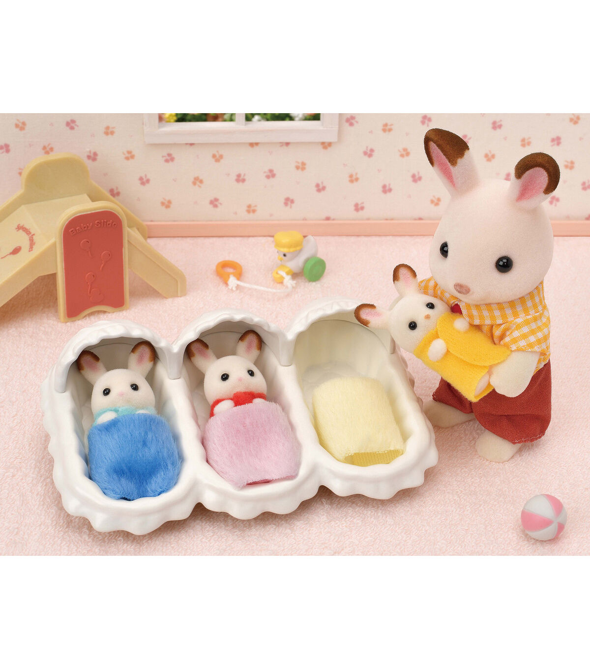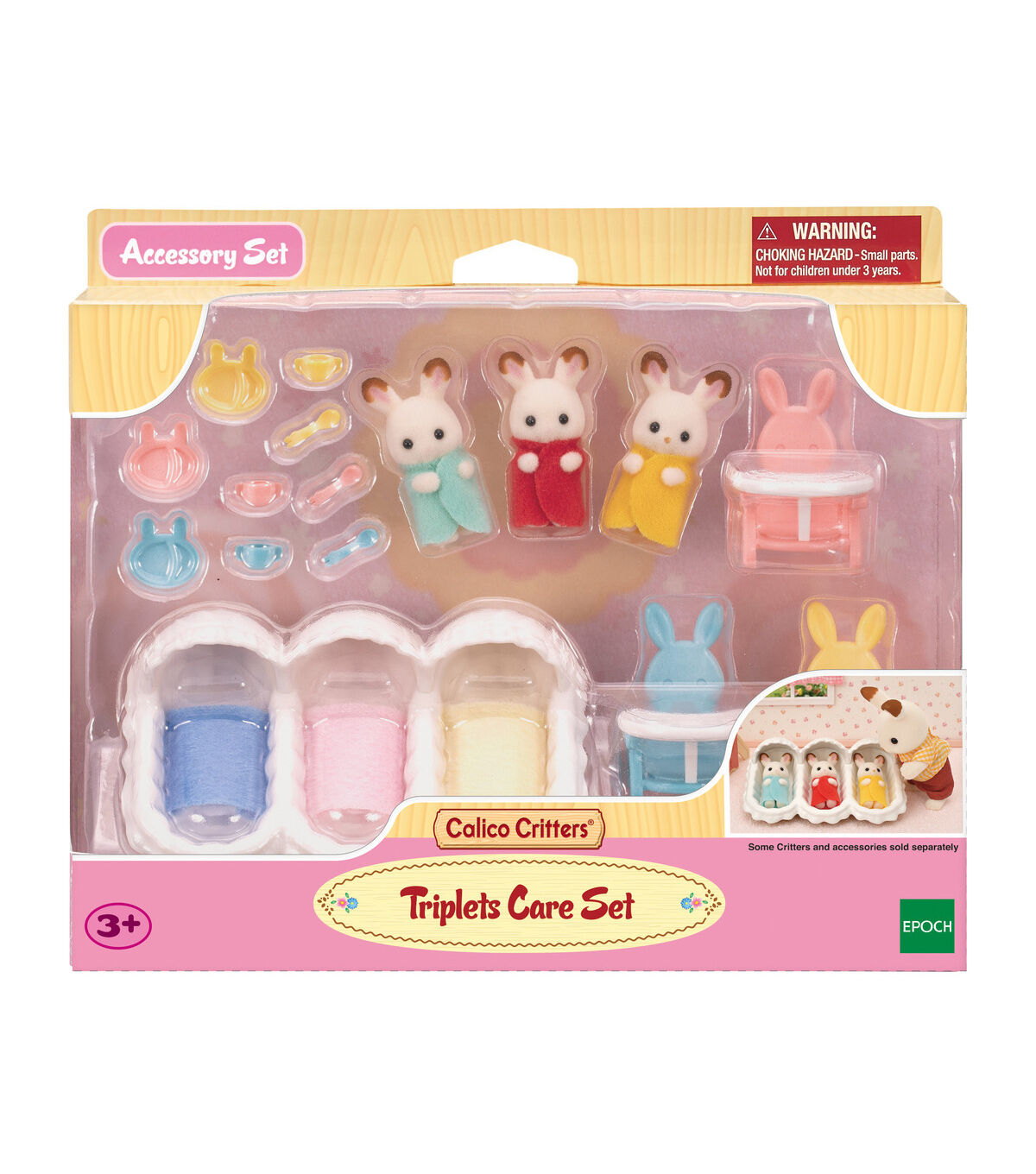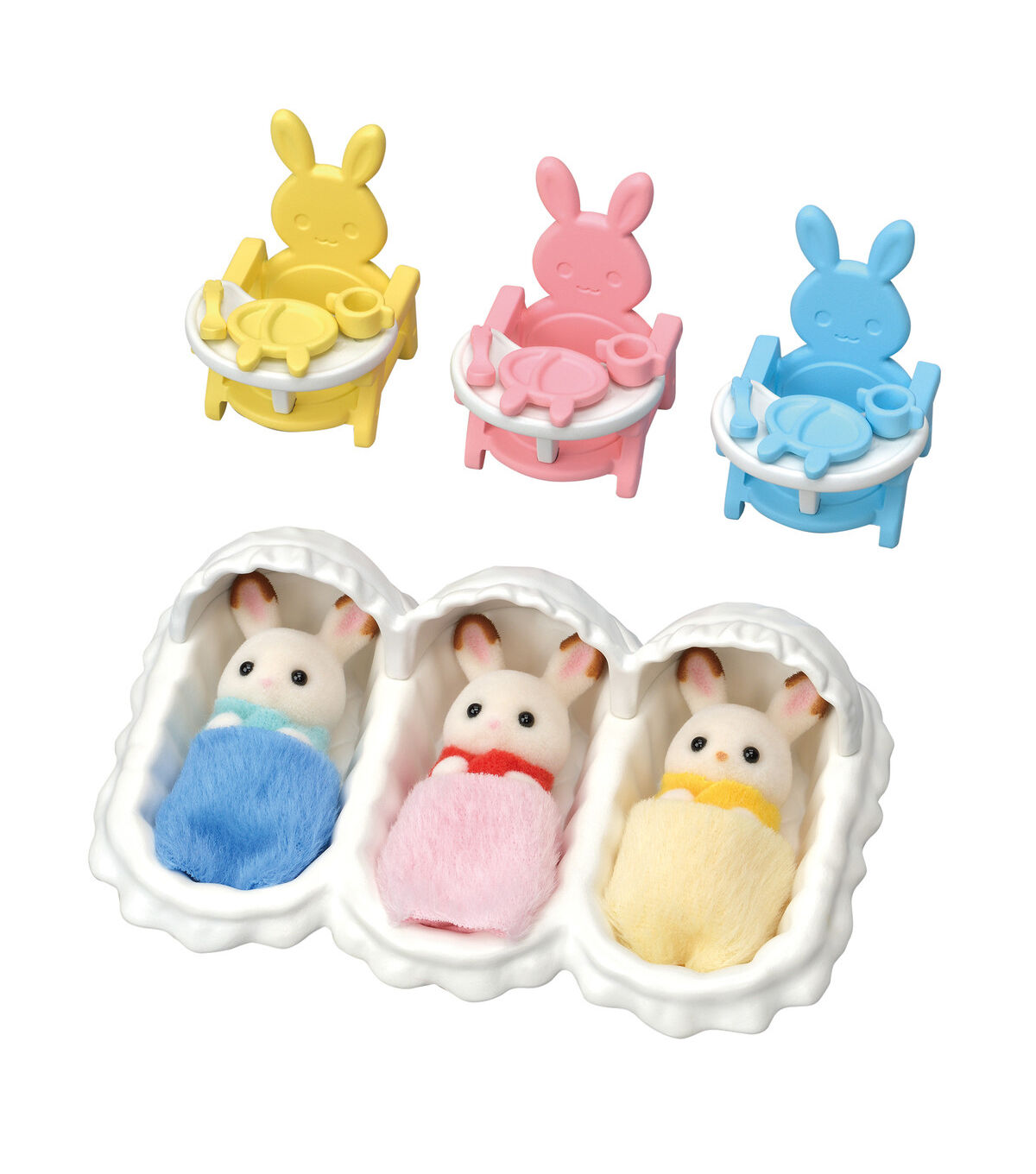 Everything you need to take care of the Hopscotch Rabbit cradle triplets is in this set. Includes Hopscotch Rabbit triplets Phillip, Fauna and Flora with rocking cradle and blankets, highchairs and feeding accessories! Calico Critters is a unique and adorable range of distinctive animal characters with charming and beautifully detailed homes, furniture and accessories. They live, work and play in an idyllic and wonderful place called Calico Village. These timeless, classic toys promote wholesome family values.