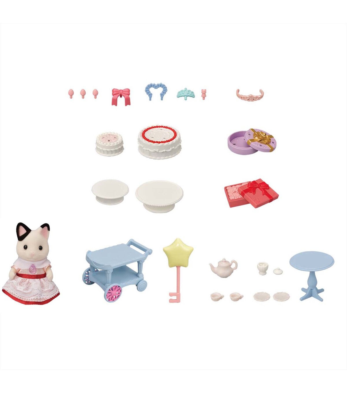 - Party time accessories include a two-tier cake with flower decorations, two cake stands, cart with star shaped balloon, present box, flower box and tea set with teapot, teacups and saucers.