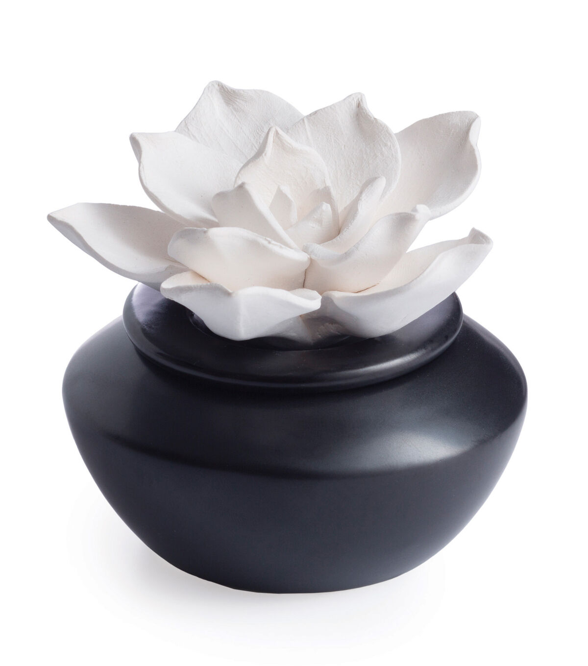 A delicate porcelain gardenia flower rests on a black vessel. Includes 3 pieces: Porcelain botanical with rope, Vessel lid, Vessel.