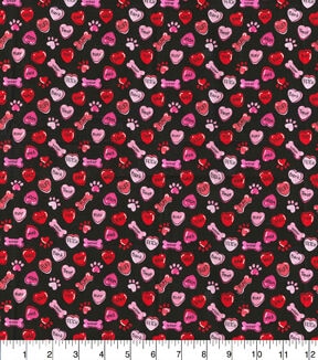 Canine Candy Hearts on Black Valentine's Day Cotton Fabric