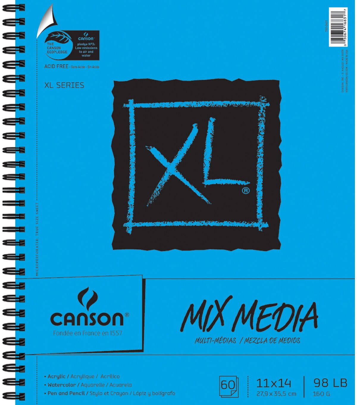 These versatile Canson XL Multi-Media Paper Pad spiral-bound pads are perfect for a variety of mediums including acrylic, watercolor, and pen or pencil. This package contains one 14x11 inch spiral-bound mixed media pad with sixty sheets of 98lb paper. Pages are perforated for easy removal. Acid free. Made in USA
