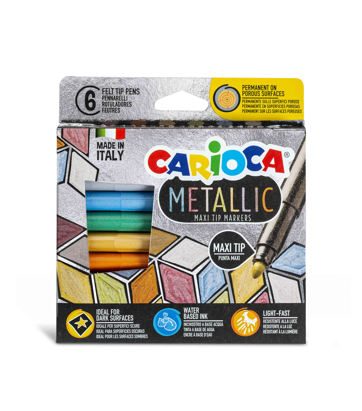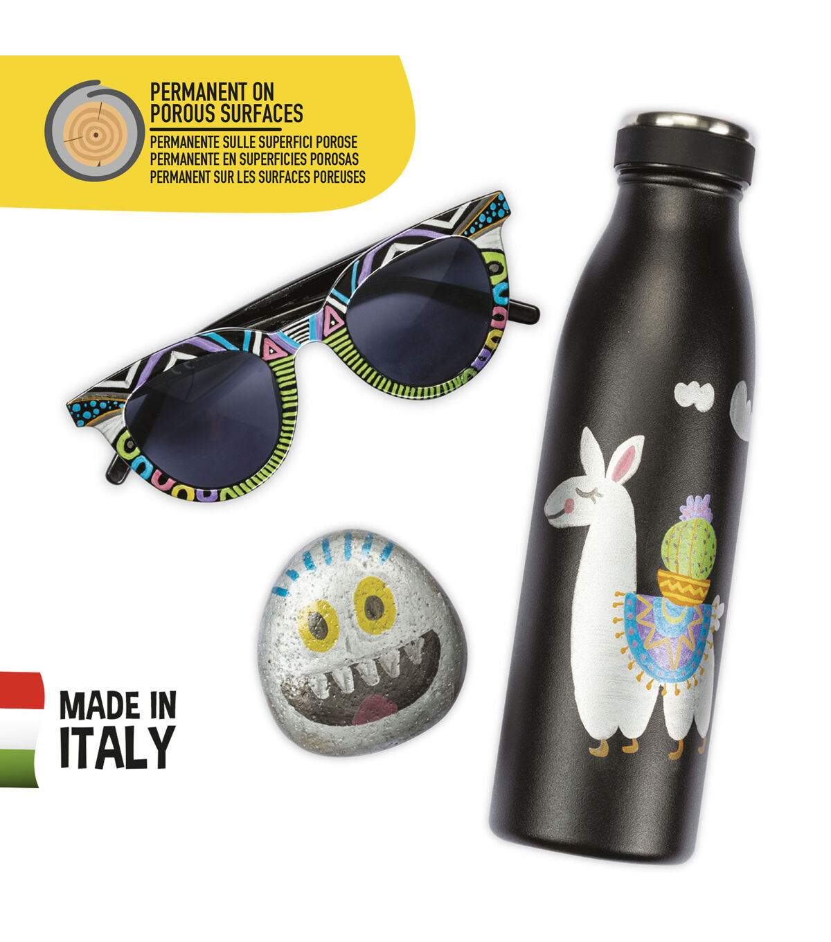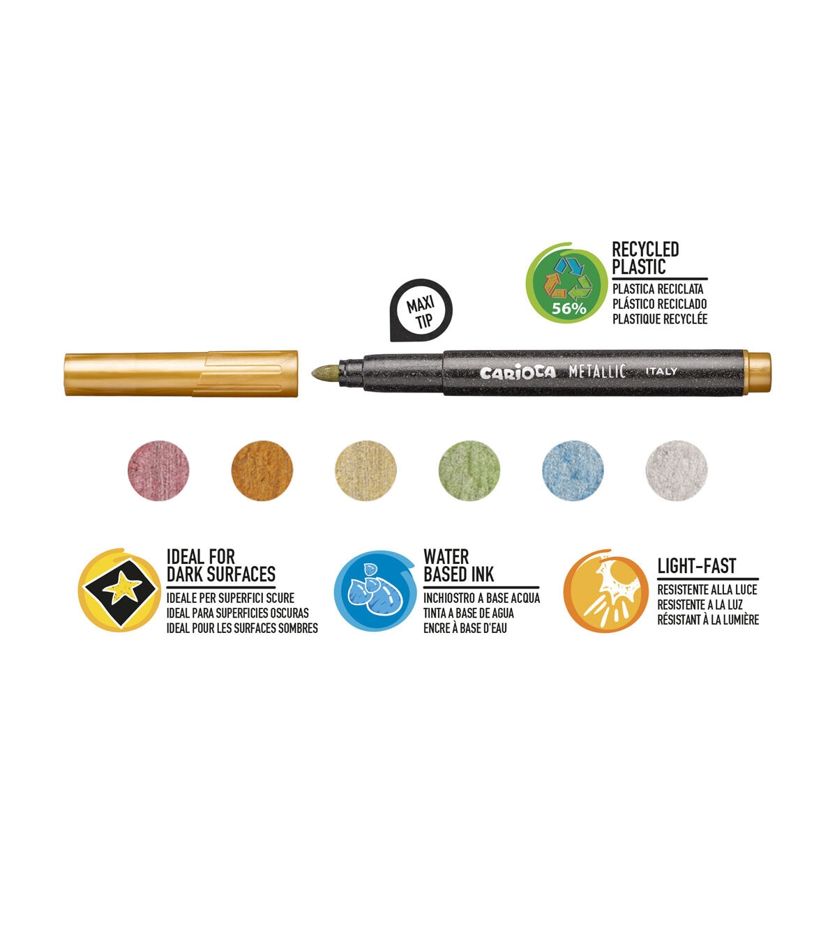 - Bright and shiny water based metallic inks in 6 colors. Eco pen barrels are 56% recycled plastic. Made In Italy proudly by family business. Permanent lightfast ink color on porous surfaces and removable on smooth surfaces. Sturdy nib releases color smoothly and is a Maxi tip shaped for wide and thin strokes. 6 popular colors Perfect for personalizing your gear, glasses, water bottles, shoes, and home or school projects. Ideal on dark surfaces for metallics to pop. Colors included are: Blue, Red, Sage Green, Gold, Silver, Copper. Made for 3 years old and up. GLUTEN FREE. NonToxic, ventilated cap, Blocked nib to withstand force, conforms to ASTM D4236
