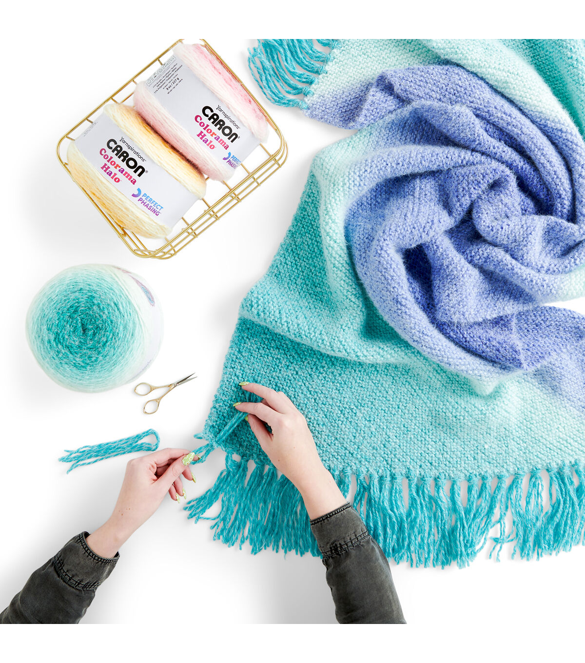 Caron Colorama Halo is a soft, luxuriously textured yarn with a beautiful soft ombre shade range. Consumers will love stitching up cozy shawls, sweaters, and accessories worry-free as the texture can help disguise any stitching mistakes.