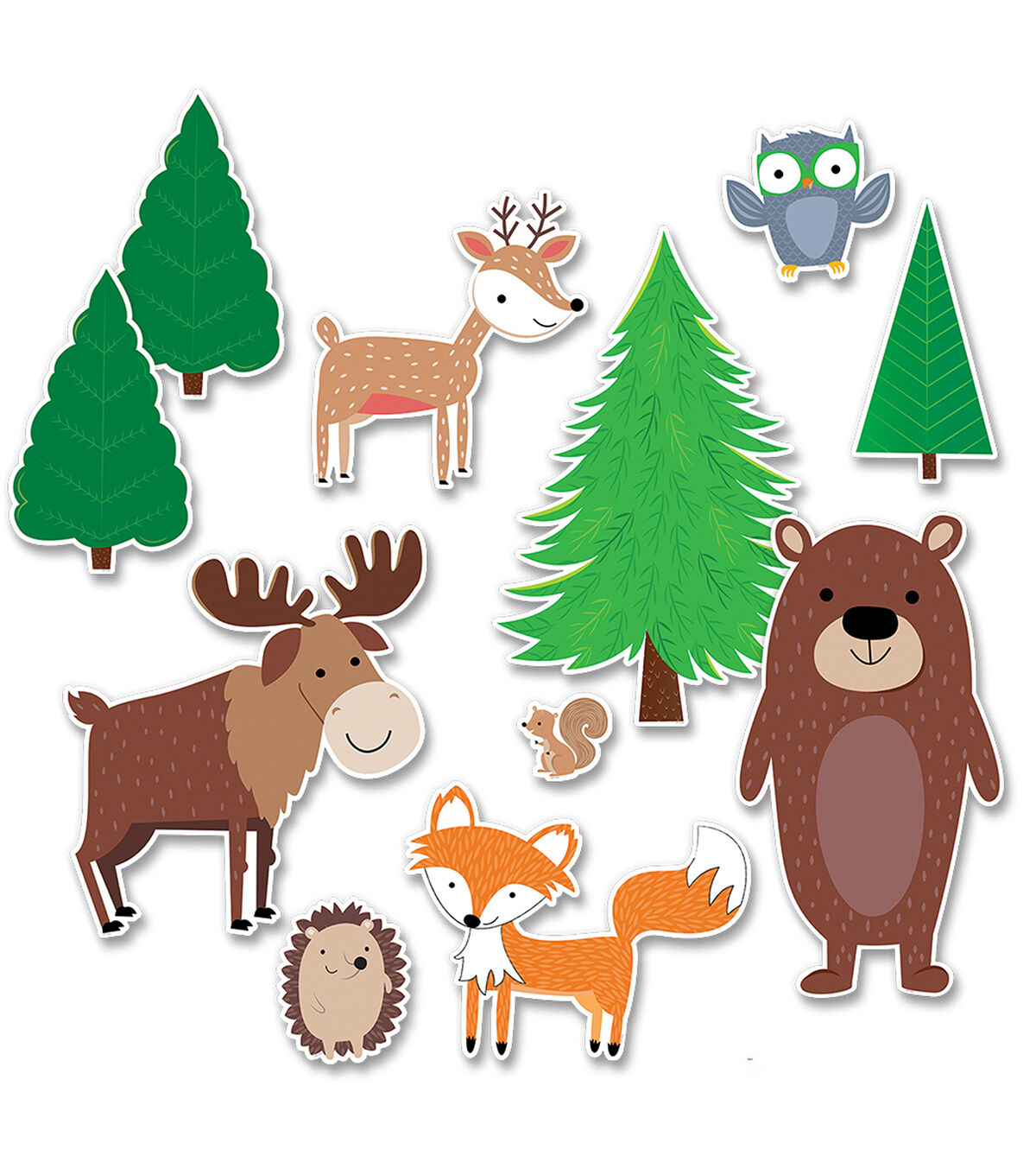 The cute and furry animals in this Jumbo Woodland Friends Bulletin Board will add charm to bulletin boards, doors, and any classroom space. These colorful woodland animals are perfect for use in a variety of classroom displays and themes: science, nature, outdoors, animals, and camping. They are also great for use at summer camps or vacation Bible school. This 11-piece animal bulletin board set includes: • moose (17.5" x 19") • fox (16.75" x 11.5") • owl (8.5" x 7.75") • hedgehog (6.75" x 8") • squirrel (4.5" x 4.75") • deer (13.75" x 15") • bear (13" x 23.5") • large tree (17" x 24.25") • 3 small trees (7.25 x 13.75", 9" x 15", and 9" x 15")