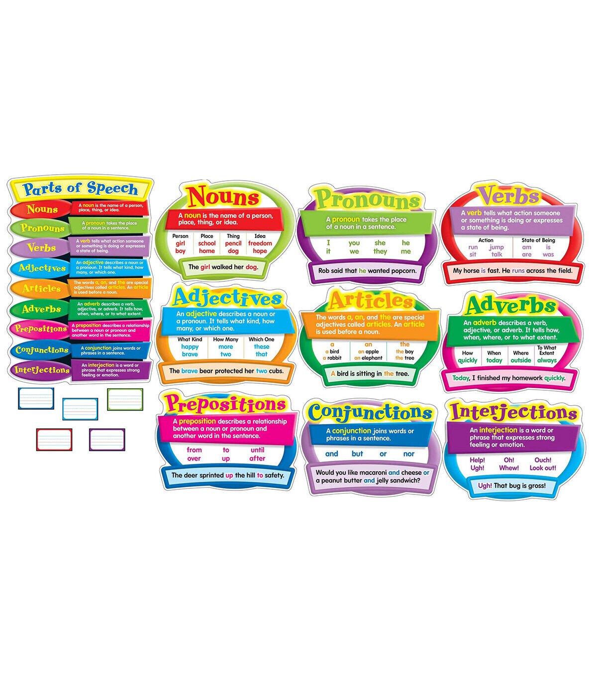 Perfect for writing centers and learning stations, the Parts of Speech bulletin board set serves as a helpful reminder to students. Each language arts bulletin board set includes: a full-color chart with the 9 parts of speech (16.25" x 23.25"), 9 vignettes containing the definition, examples, and an example sentence for each one of the nine parts of speech (Nouns, Verbs, Pronouns, Adjectives, Articles, Adverbs, Prepositions, Conjunctions, and Interjections), 16 blank cards with writing lines, and a resource guide. Sold as a pack of 2 bulletin board sets.