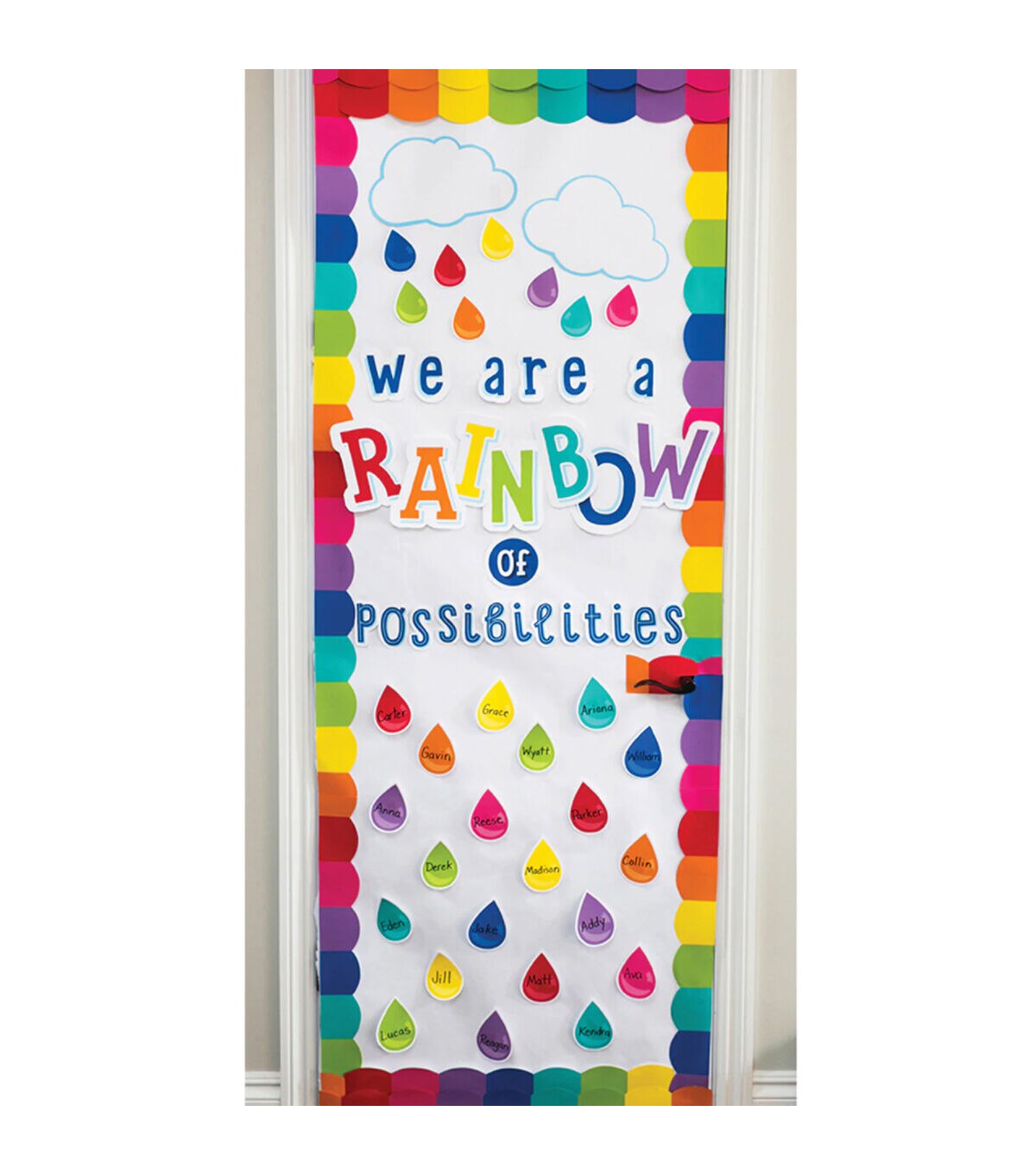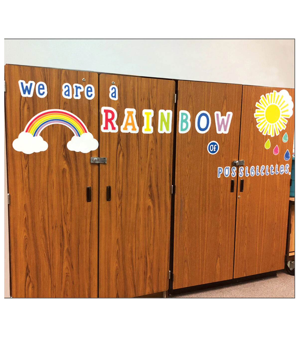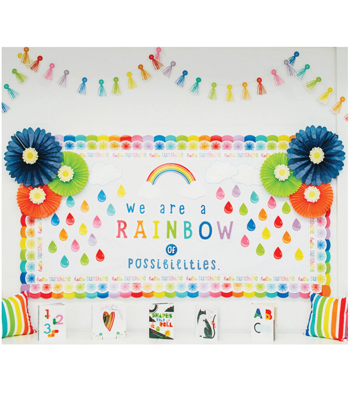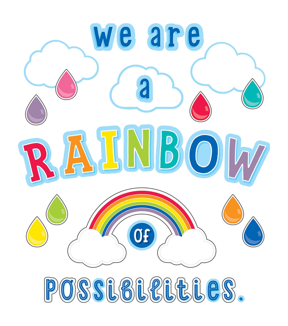 Give your classroom style that inspires with creative bulletin board displays. Inspire students year-round with the celebratory 67-piece We Are a Rainbow of Possibilities Bulletin Board. Featuring a rainbow, clouds, and colorful raindrops, this set includes the following pieces: • 1 message, assembled from 28 pieces (largest: 7" x 7.3", smallest: 1" x 1") • 1 rainbow with clouds (22.3" x 11.9") • 35 raindrops (3.2" x 4.5") • 3 clouds (largest: 11.4" x 7.8", smallest: 11.1" x 7.2") The Hello Sunshine Collection features pretty colors, fun patterns, and a touch of sunshine that will make your classroom a haven of happiness. Inspirational bulletin boards are perfect for adding motivation to any area of your classroom. Designed for versatility, these sets are ideal for creating several small displays or one large display. Make sure to view coordinating Hello Sunshine products to create a colorful and organized classroom. Schoolgirl Style?s line of trendy classroom accessories helps to take the guesswork out of styling and managing classroom design. Each collection, designed by Melanie Ralbusky, offers a signature look that will transform empty spaces into extraordinary spaces for students to enjoy. The variety of décor options in the Schoolgirl Style collection makes it possible for anyone to design and decorate classrooms that inspire learning and joy!