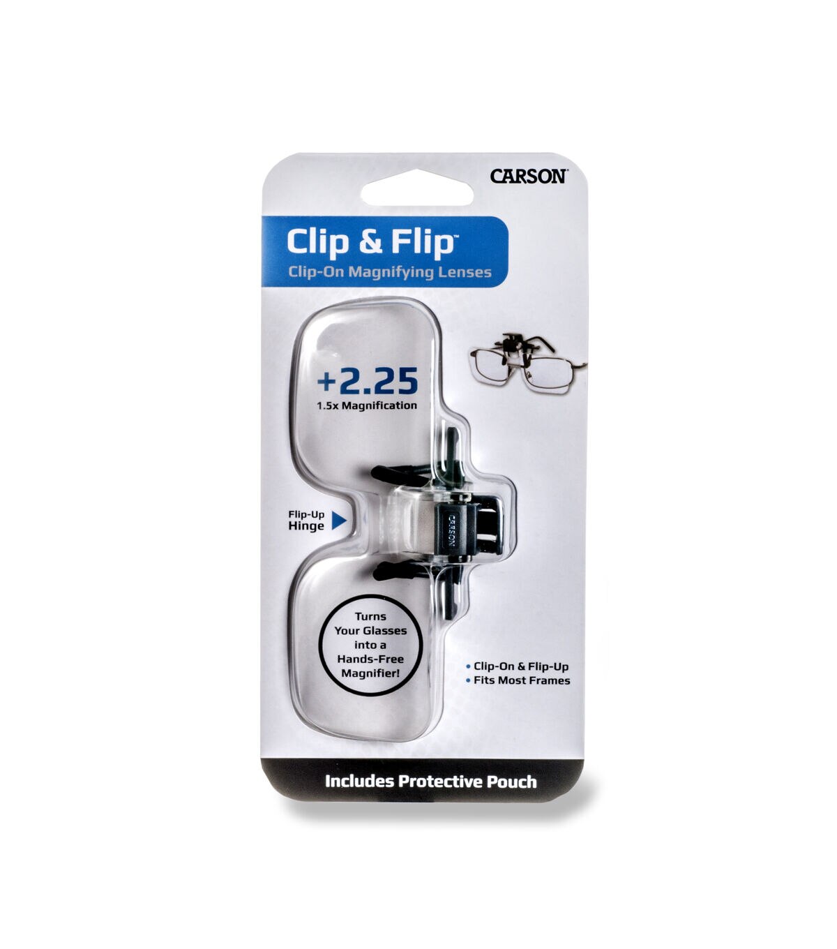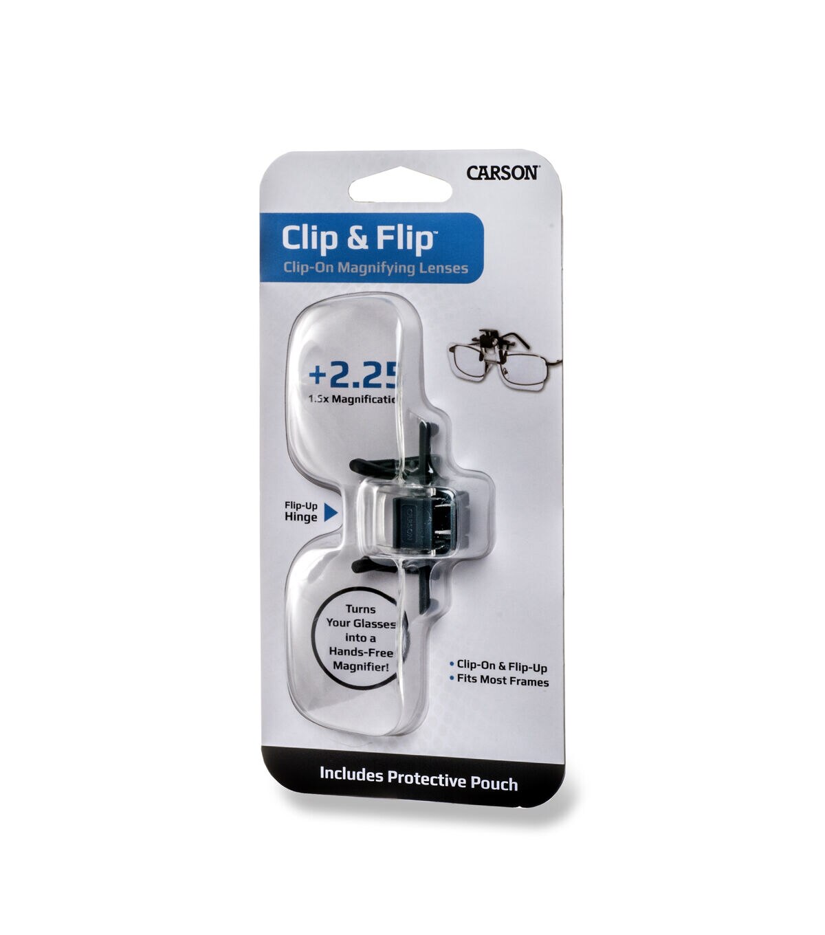 The Clip & Flip (OD-10) magnifying lenses from CARSON turns any pair of regular glasses into a "flip down" handsfree magnifier. Simply clip the Clip&Flip magnifying glasses onto the frame of your regular glasses, reading glasses, or sunglasses. Then, flip the magnifier up for normal viewing or down for a hands-free magnified image. The Clip&Flip magnifying lenses have a 1.5x power magnification which is equivalent to +2.25 Diopters. Our magnifying lenses are perfect for hobbies, crafts, sewing, needlepoint, crochet, cross-stitch, model building, jewelry design, reading and so much more. The crystal clear acrylic lenses will give you a sharp, distortion free view that allows you to see the finest details with ease. Each Clip & Flip magnifying lens comes included with a protective soft pouch to protect the lenses from dust and scratching. They are lightweight, easily storable and perfect to travel with. At Carson, we are so confident in our magnifiers that we back them with a Lifetime Limited Warranty!