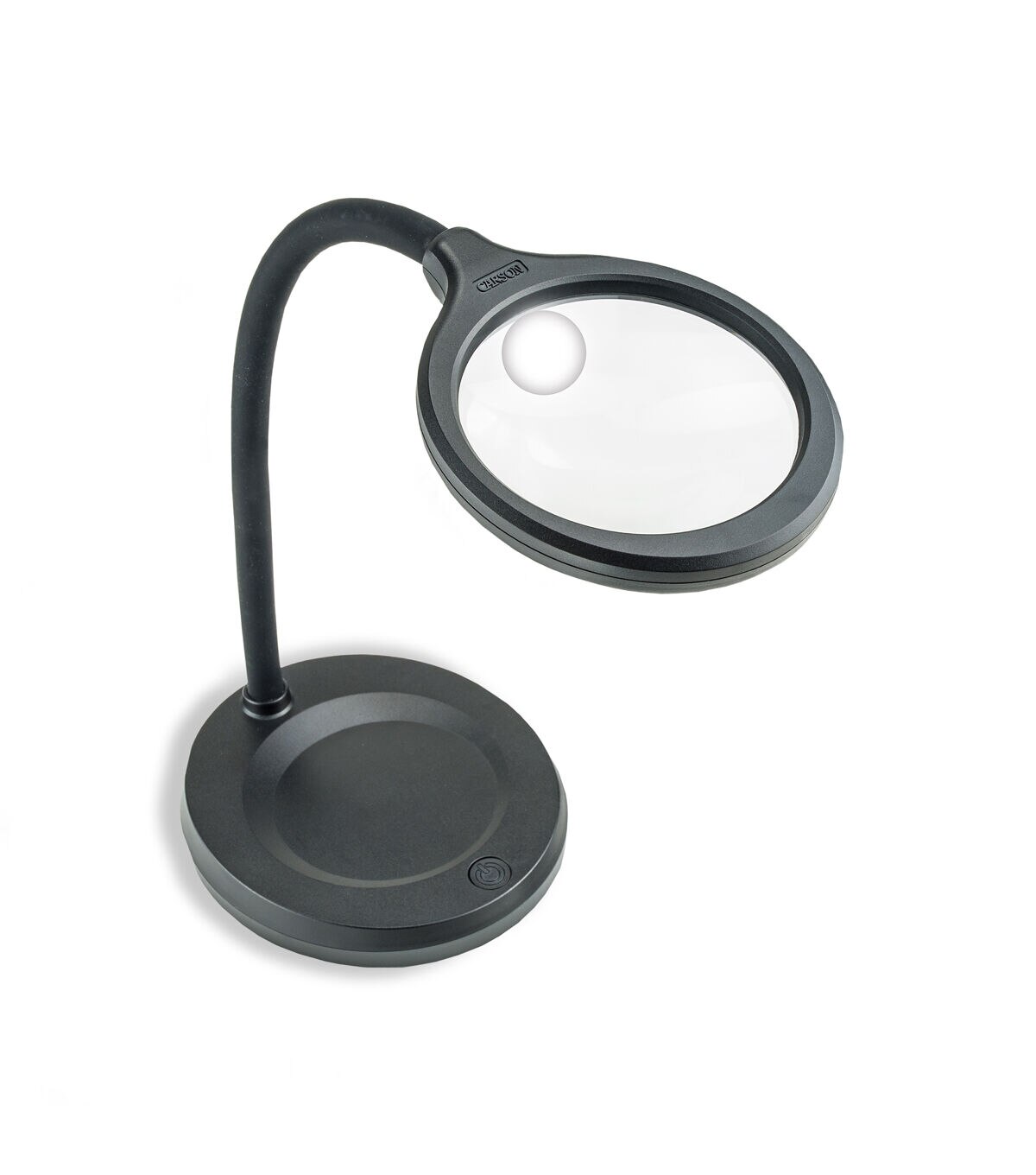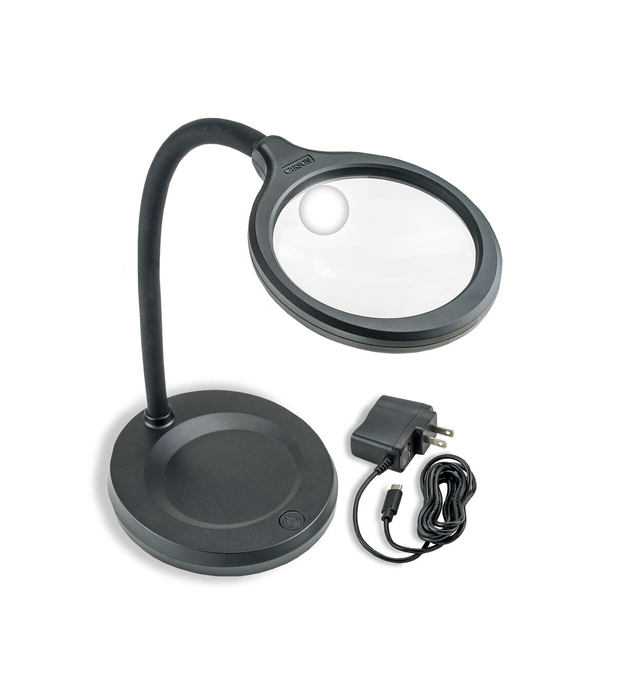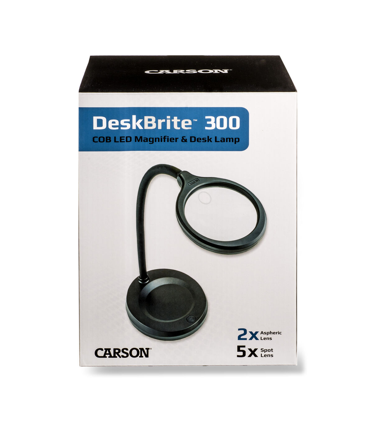 The DeskBrite 300 (LM-30) from CARSON is a 2x aspheric COB LED desk top magnifier with 5x spot lens. It features 4 super-bright COB LED lights with a built-in diffusive cover. Light diffusers work to eliminate LED hot spots, blending and evenly distributing the light. COB LEDs are brighter than traditional LEDs, provide a greater uniformity of lights and consume less power. Its large 4.3 in. crystal-clear aspheric, acrylic lens provides a large viewing area for any hobby. Aspheric magnifying glass lenses allow for increased magnification and image clarity while greatly reducing edge to edge distortion. This desk lamp also has a flexible goose neck that allows you to position the magnifier where you need it. It uses a USB-C to US wall adapter with a 6 ft. cord or can be powered by using 3 AA batteries (not included). It's the ideal low vision reading aid for books, menus, magazines, newspapers, etc. Versatile hands-free magnifier for crafts, hobbies, inspection, and tasks such as model building, soldering, jewelry design, needlepoint, sewing, quilting, cross stitch, coin and stamp collecting, and much more! At Carson, we are so confident in our magnifiers that we back them with a Lifetime Limited Warranty!