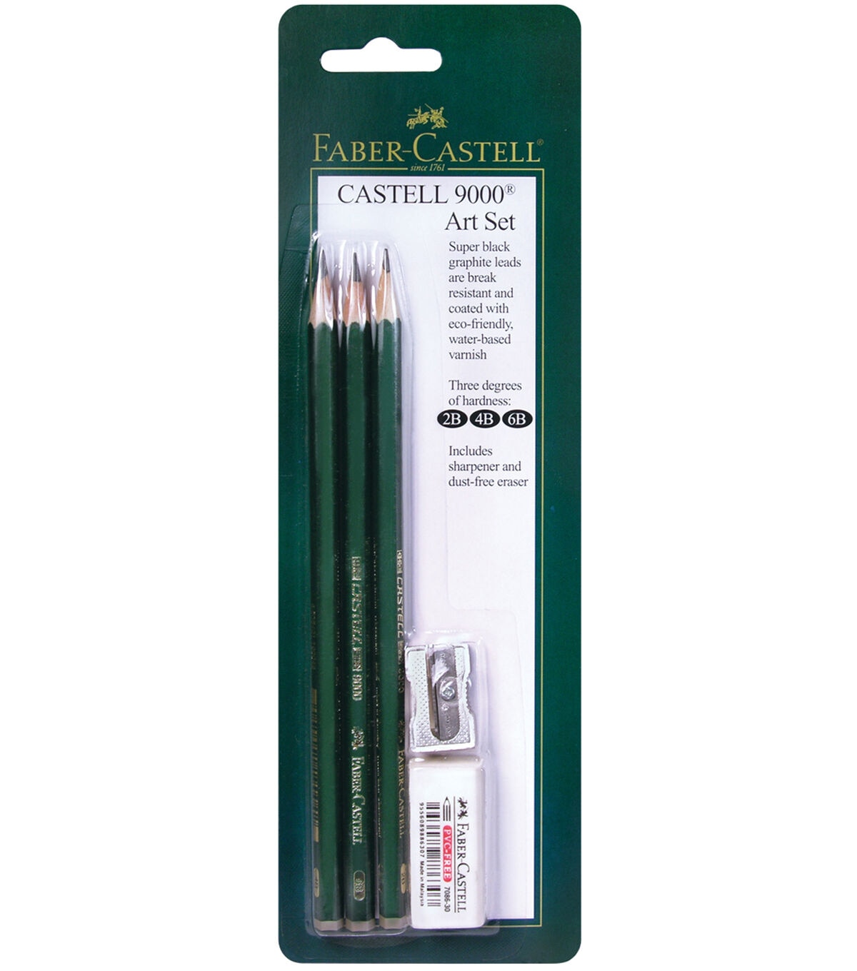 FABER-CASTELL-Castell 9000 Art Set. The Castell 9000 pencils have superior leads made of finely ground graphite and clay. These pure graphite pencils are never scratchy and are excellent for writing, drawing, and sketching. This package contains three pencils (one 2B hardness, one 4B hardness, and one 6B hardness, one sharpener, and one dust-free eraser. Conforms to ASTM D 4236. Imported.