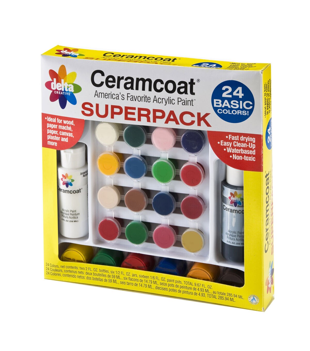 Ideal for wood, paper mache, paper, canvas, plaster and more! Fast drying and easy clean up! 24 Basic Colors: 2- 2 oz Bottles; 6- 1/2 oz Jars; 16- 1/6 oz Paint Pots.