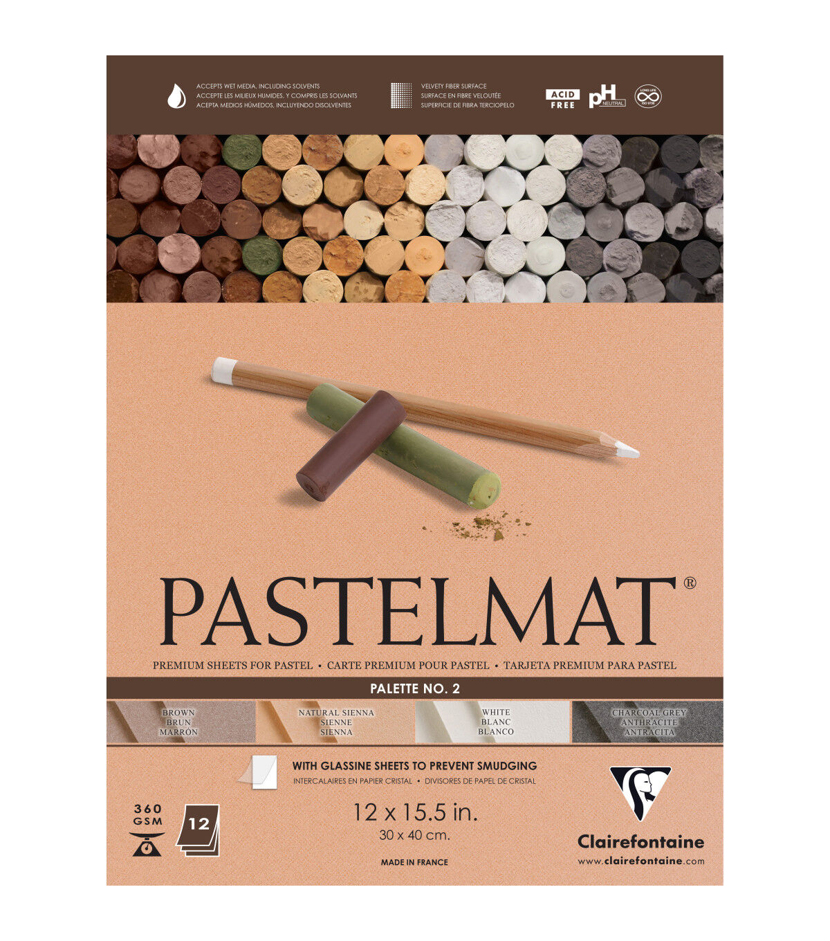 Pastelmat pads from Clairefontaine were designed to meet the specific expectations of serious pastel artists. Pastelmat's strong, buttery surface has more tooth than traditional Ingres papers but is not abrasive, allowing painterly effects to be achieved. Its texture allows it to grab onto the pastel, breaking up the pigment and pulling it deep into the surface for exceptionally vibrant color. Flat tints, precise details, or delicate and transparent veils are easily realized. The use of fixative is not necessary with Pastelmat. This paper's rigidity, weight, and light-resistance guarantee conservation of the artwork. Each pad is glue-bound and contains 12 sheets. Each page is separated by glassine sheets to prevent smudging. Palette 2 (PL2) Pads contain three sheets each of white, natural sienna, brown and charcoal gray.