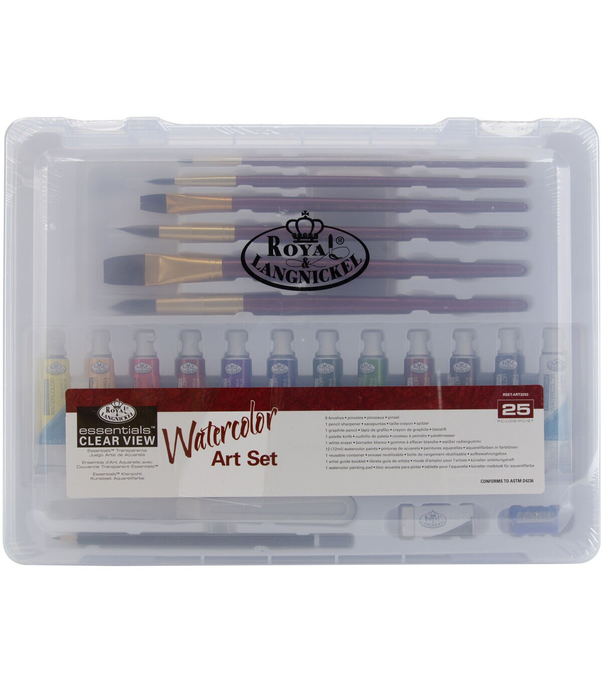 ROYAL BRUSH-Royal & Langnickel: Watercolor Art Set. This amazing Watercolor Art Set is perfect for artists of all skill levels. Included are twelve tubes of watercolor paints (12mL each); six assorted brushes; one graphite pencil; one pencil sharpener; one palette knife; one white eraser; one 9x12 inch painting pad with ten sheets of 108.1-lb paper; and one artist guide book. All pieces come in a convenient 10-1/2x14 inch clear plastic carrying case. Conforms to ASTM D4236. Imported.