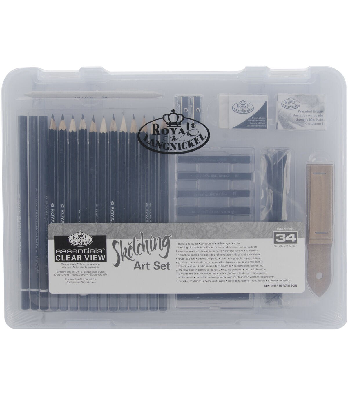 ROYAL BRUSH-Royal & Langnickel: Small Sketching Art Set. This amazing Sketching Art Set is perfect for artists of all skill levels. Included are twelve graphite pencils; six graphite sticks; three charcoal pencils; three charcoal sticks; four pieces of vine charcoal; one pencil sharpener; one sanding block; one blending stump; one kneadable eraser; and one white eraser. All pieces come in a convenient 9-1/2x12 inch clear plastic carrying case. Conforms to ASTM D4236. Imported.