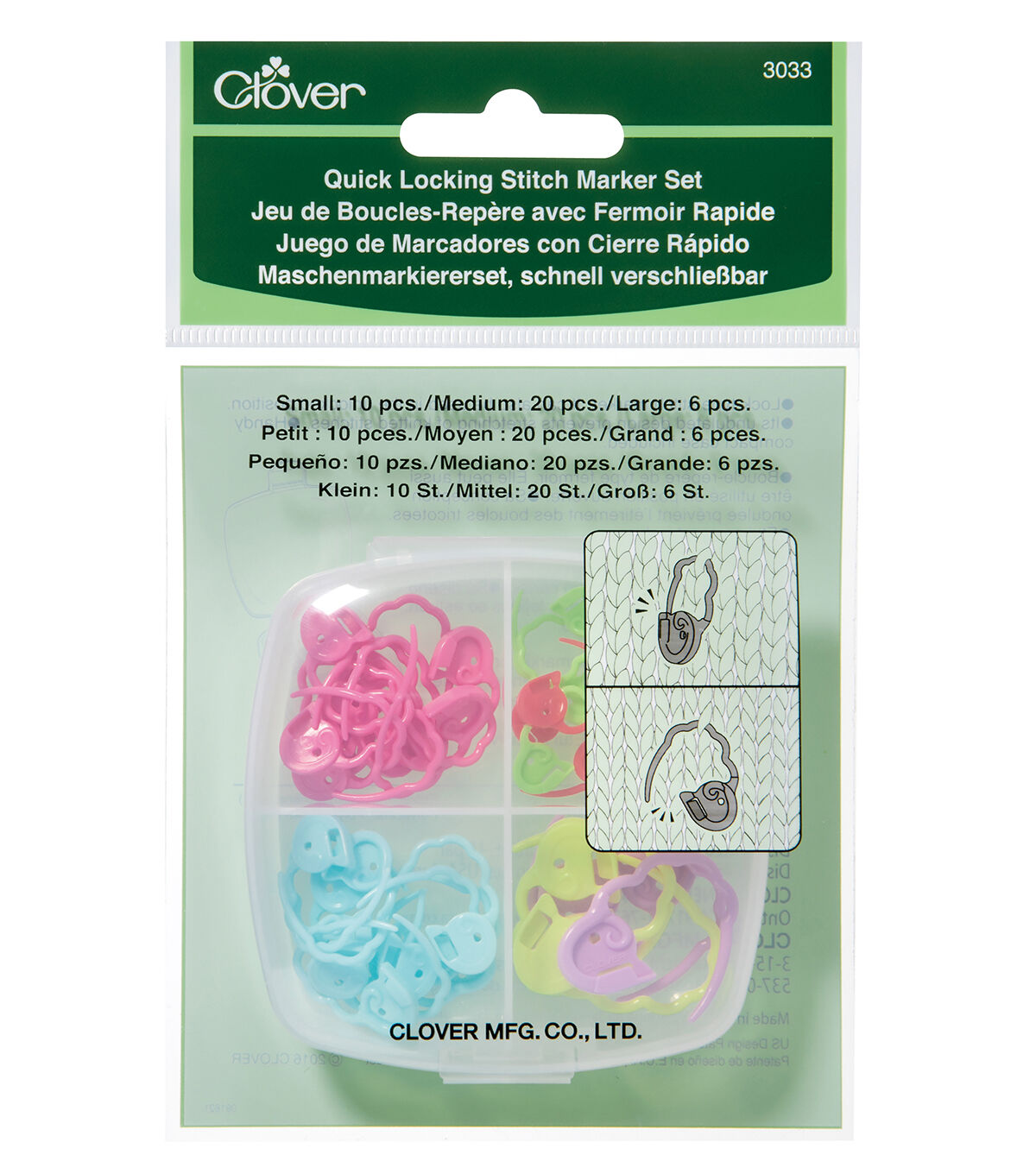 Ideal for your sewing projects, the Clover Quick Locking Stitch Marker Set includes three different sizes (small, medium and large) of markers. These stitch markers can be used in both locked and unlocked position. Their undulated design prevents stretching of stitches and vibrant colors make it easy to find.