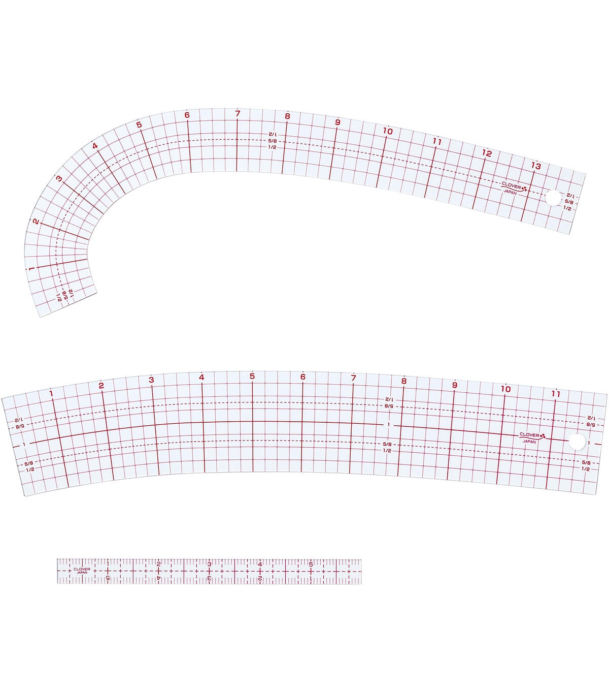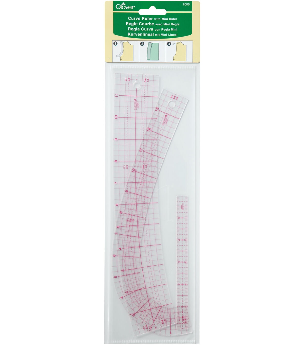Essential set of rulers for pattern drafting and adjustments for garment sewing and fashion design. Used on arm holes, neck lines, hip lines and hems. This 4.25x15.75 inch package contains one French curve, one hip curve and one mini ruler. Imported.