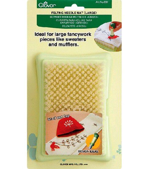 CLOVER-Felting Needle Mat is ideal for large fancywork pieces like sweaters and mufflers. The brush-like mat enables smooth punching with little resistance and allows the fibers of the applique to mesh well with the base fabric. The bristle length provides the ideal hardness and density for punching. Simply place the applique over the base fabric and pierce lightly with the Needle Felting Tool (sold separately). The fiber will become interlaced, attaching the motif to the fabric beautifully. Made of bristles, base of polypropylene. Color: green and cream. Measures: Large, 6.25Hx4.5Wx2.25D. Imported.