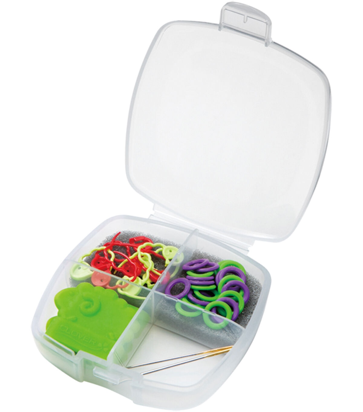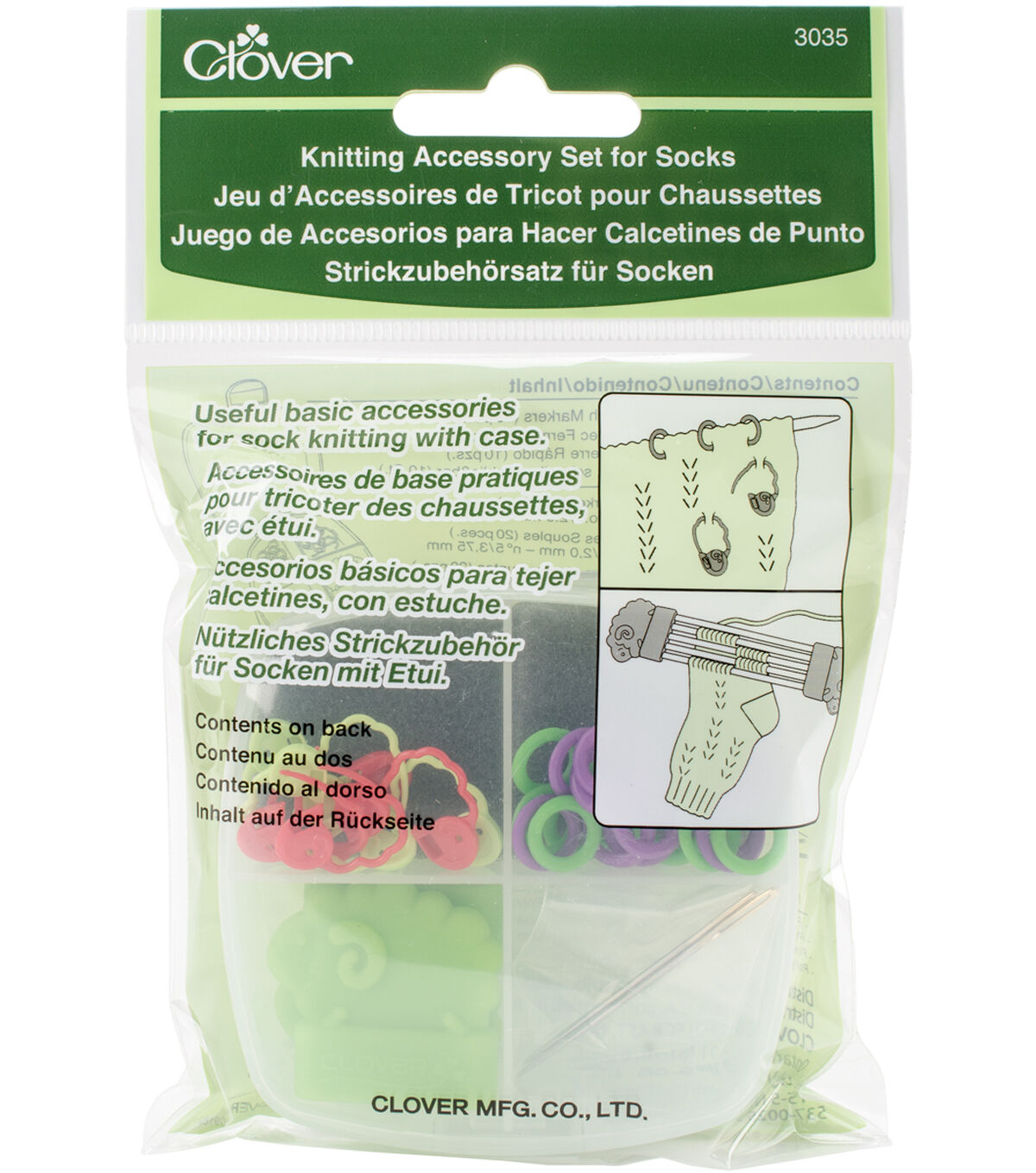 The Clover-Knitting Accessory Set for Socks is composed of useful basic accessories for sock knitting. This package contains 10 quick locking stitch markers, 20 soft stitch ring markers, two double-pointed need protectors and daring needles in No. 20 and 21 in a 0.75 x 3 x 3-inch storage case.