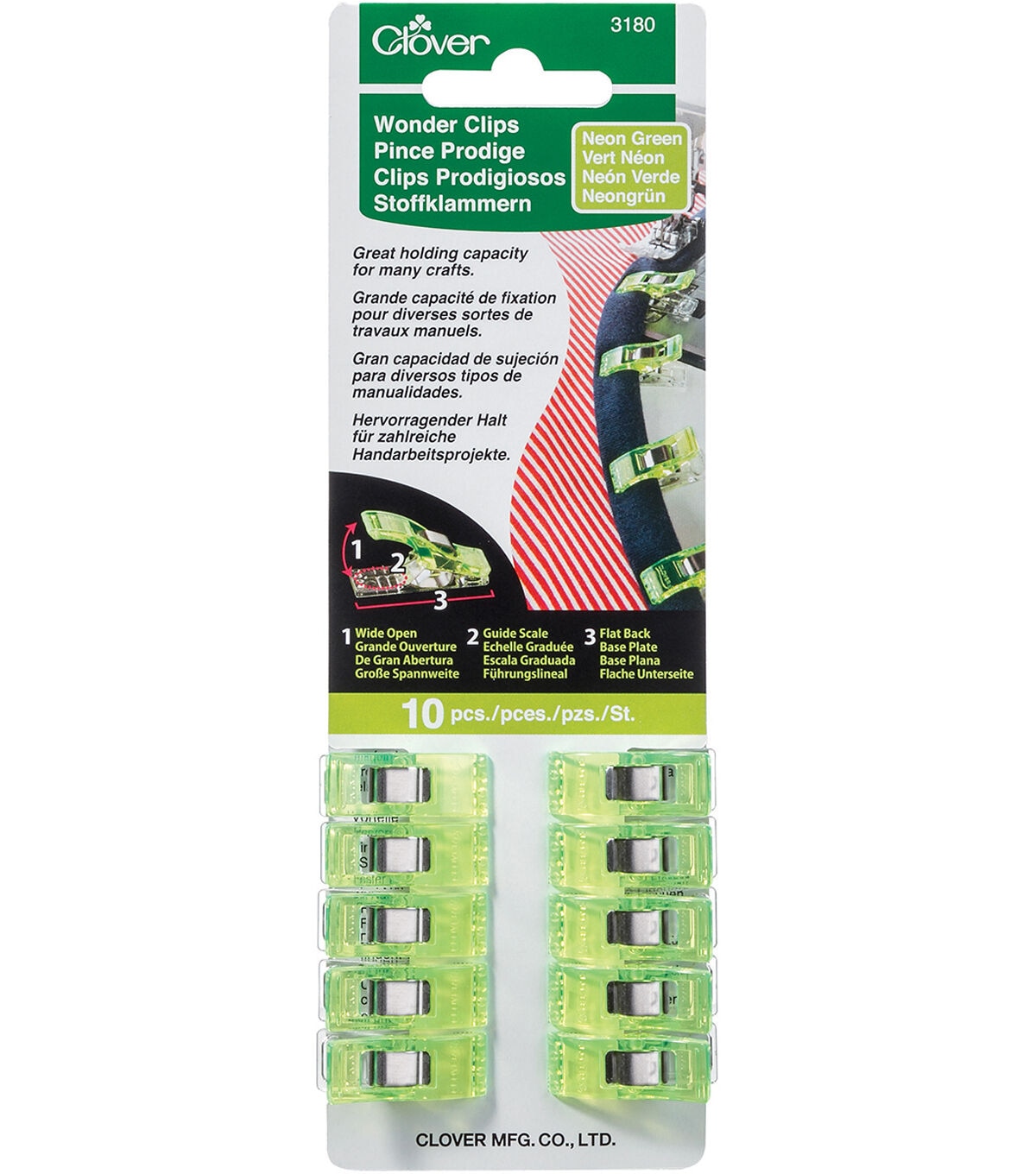 The Clover Wonder Clips - Neon Green are a great alternative to pins, especially when working with heavyweight fabrics, piles and vinyl. These neon green clips can hold layered sections of sewing projects such as handle connectors to handbags and piping without distortion. They also work well with servers. This pack includes 10 clips with a seam allowance of up to 0.5 inches.