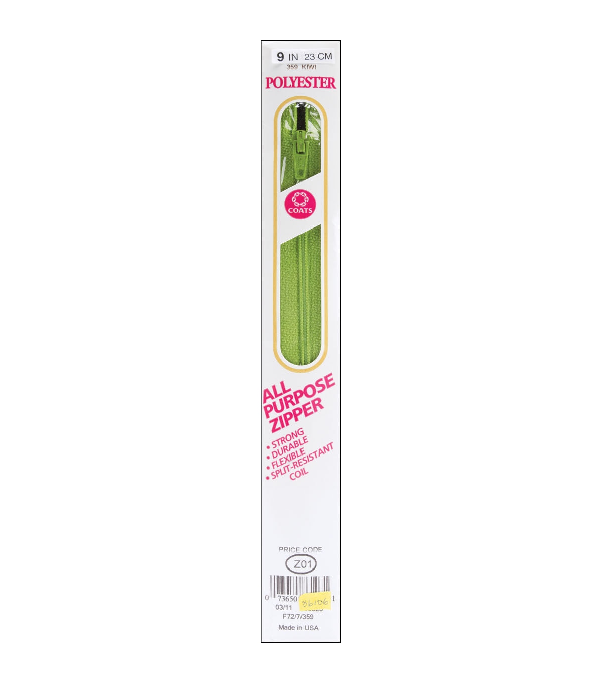 COATS&CLARK-Zipper. Soft, flexible and strong closed bottom zipper that was designed for comfort. Coats Polyester All Purpose Zipper features a coil zipper with a flat covered back so that the zipper is smooth against the skin. The coil is woven into the polyester tape so that it is split resistant, and the zipper does not need to be preshrunk! This all-purpose zipper is ideal for use in pants, skirts, dresses, sportswear and home decorating items. This package contains one 9in zipper. Available in a variety of colors: each sold separately. Made in USA.