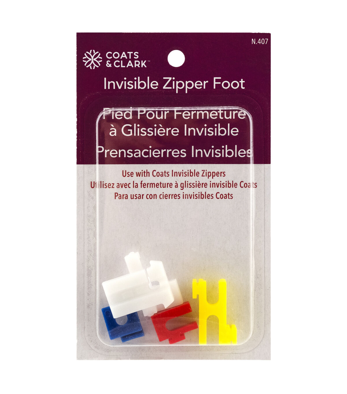 Included are three color-coded plastic shanks designed for four different machine types. (One shank is reversible) Use to install Coats & Clark and Talon® Invisible Zippers. 4 pc.
