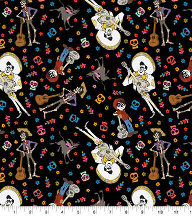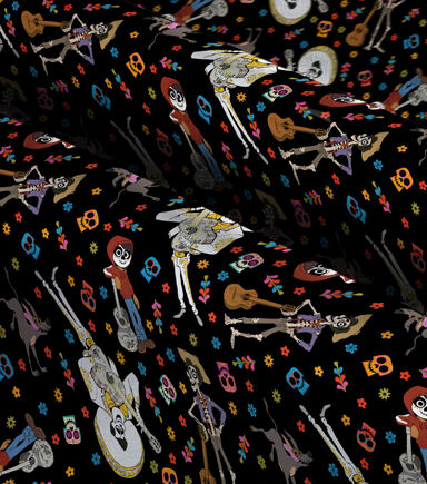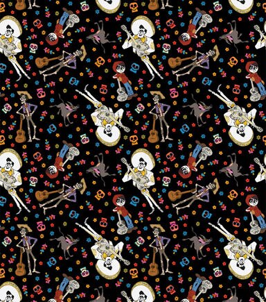 This Coco Character toss is covered in all your favorite Coco Characters such as Ernesto De la Cruz and others. This fabric is super colorful with flowers and skulls on a black background. This would be perfect for any kind of bedding or a throw blanket for anyone that loves Coco. This fabric is 100% cotton and machine washable.
