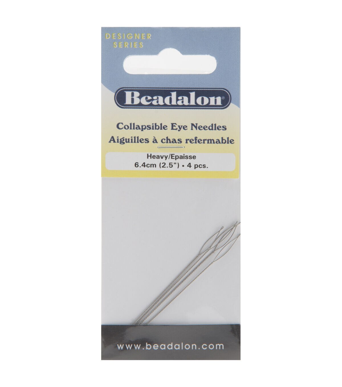 Collapsible Eye Needles are flexible and are particularly nice for stringing beads and have collapsible holes. Extra-spring wire is heavy, kink-resistant and has a specially designed eye that automatically collapses and instantly reshapes when it is pulled through the bead. The large eye is easy to thread and accommodates many sizes of cord. 2-1/2 length makes stringing beads easier. 4 per package