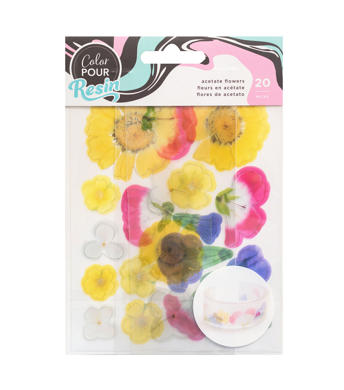 Discover new ways to be colorfully creative with Color Pour Resin! Add dimension and texture to your resin projects with these mix ins. This set of acetate flowers is great for adding an elegant feel to coasters, trays and more. This package includes 20 acetate flowers.