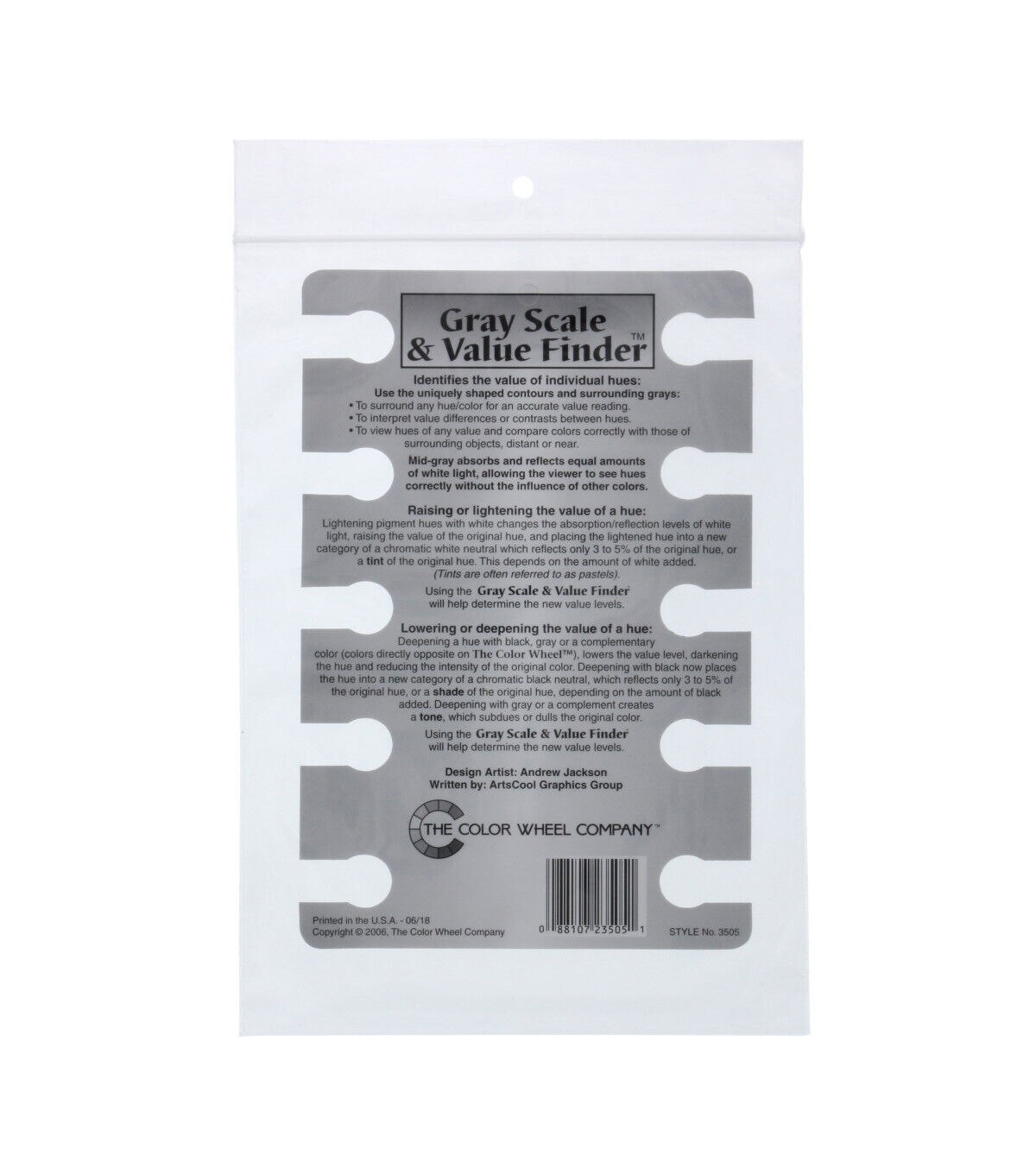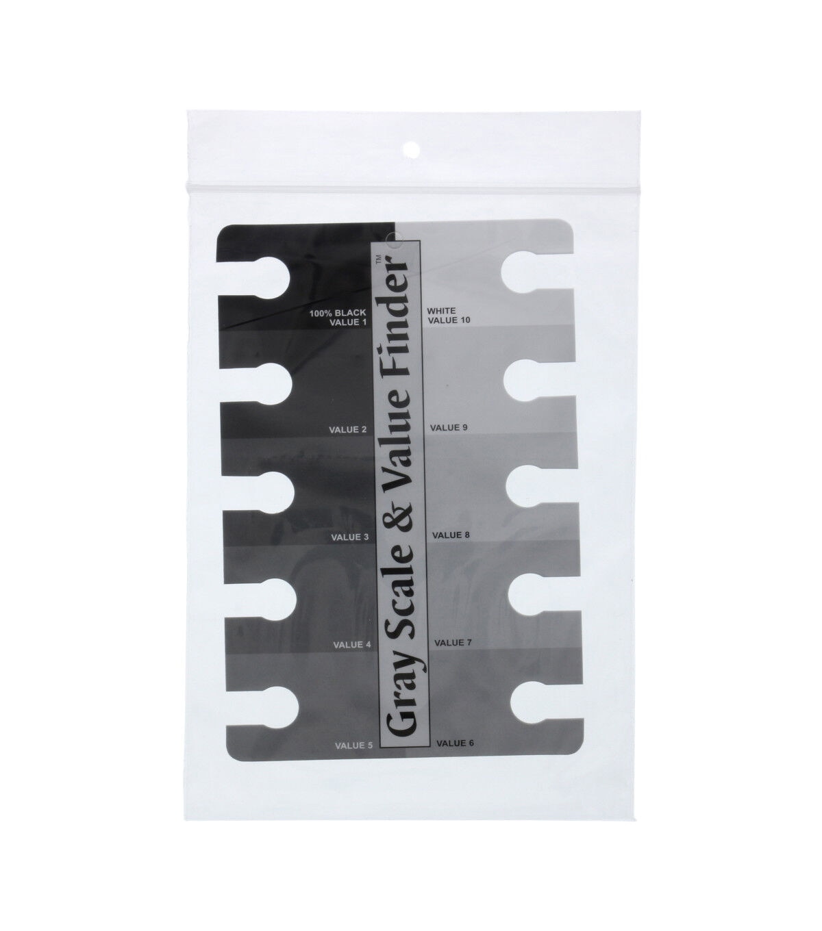 An invaluable tool for artists, teachers and students, the Gray Scale and Value Finder allows you to identify the value of blacks, whites and colors in all media. From 10% black to 100% black, each swatch is accompanied by a cut-out shape for value and intensity comparisons. The Finder can also be used as a guide to making colors lighter and darker with varying values of neutral gray.