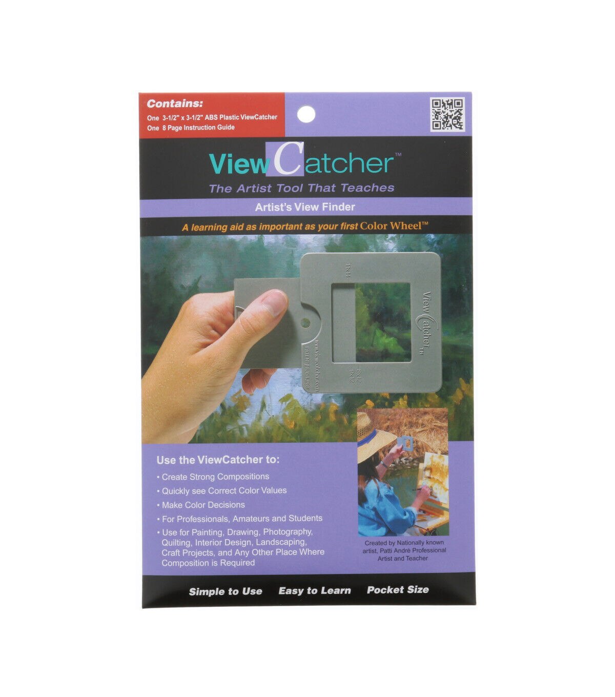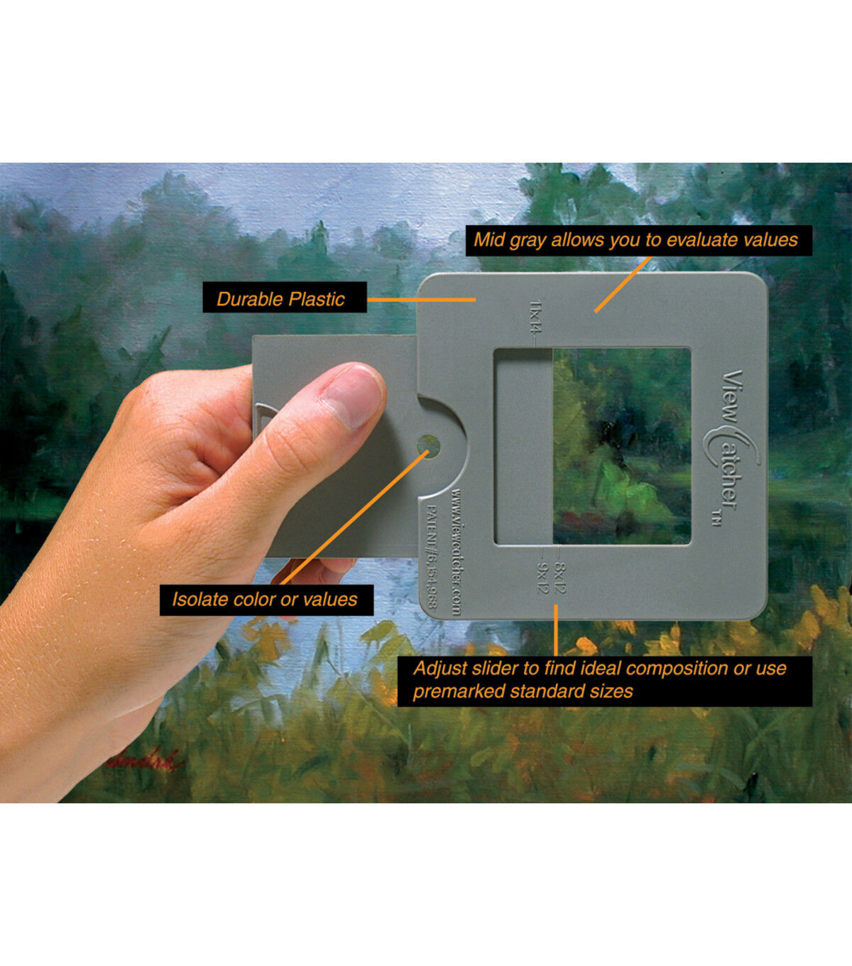 Take your time choosing a composition - frame your perspective with the ViewCatcher. Useful for framing and composition for fine art, crafts and photography, the device slides open to provide a viewing window that features indicators for standard proportions used for framing purposes, such as 8" x 10", 12" x 14", etc. , it has a convenient thumb grip for opening the viewing window. A small round opening in the center of the sliding window allows you to determine the value of the colors your are viewing.