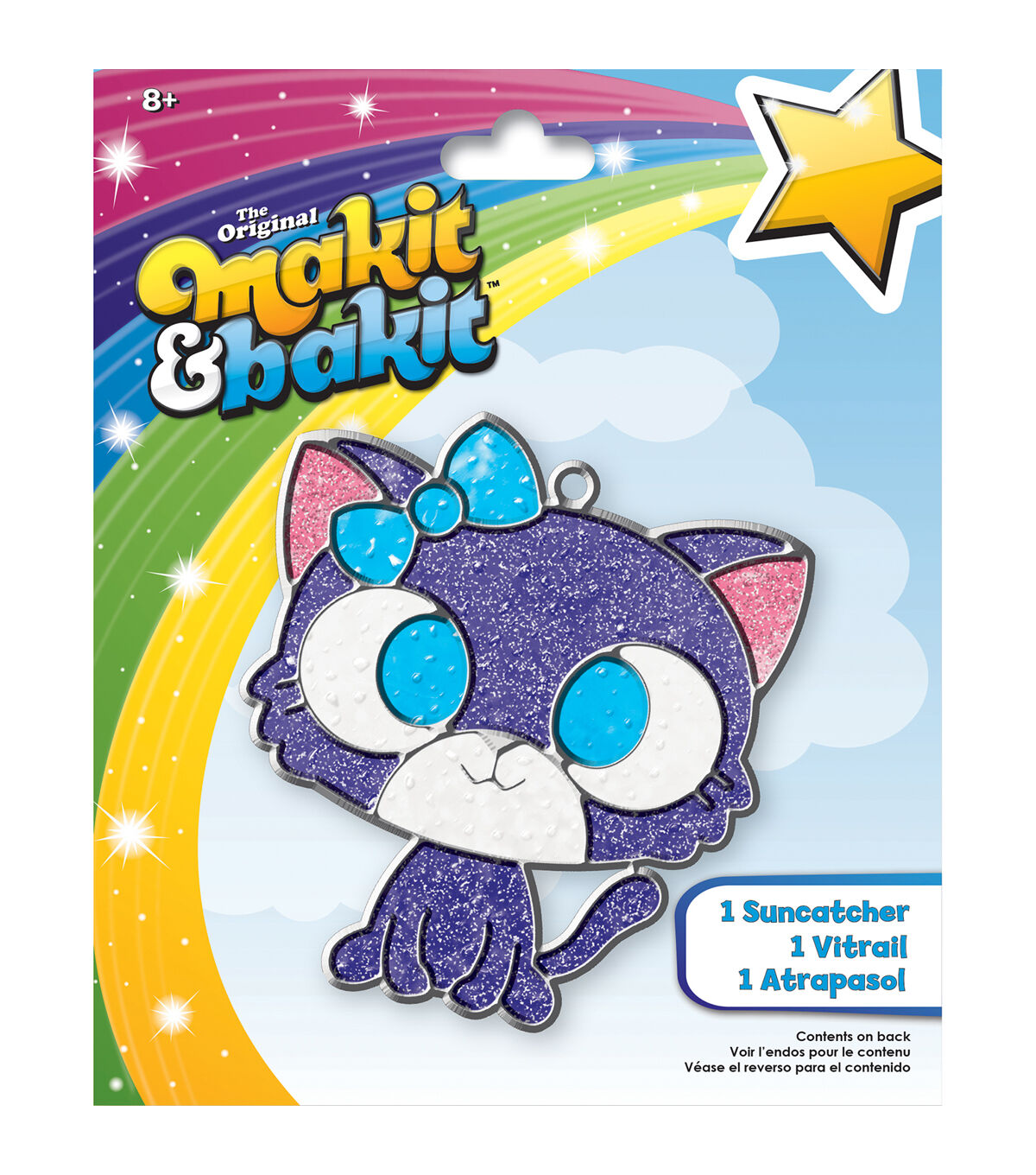 Make a fun, colorful suncatcher with the Makit & Bakit Suncatcher Kit-Kitten. Parental supervision is recommended. It is suitable for kids aged eight and up. This pack contains one metal frame, 0.74 ounce of baking crystals, one suction cup and easy-to-follow instructions.