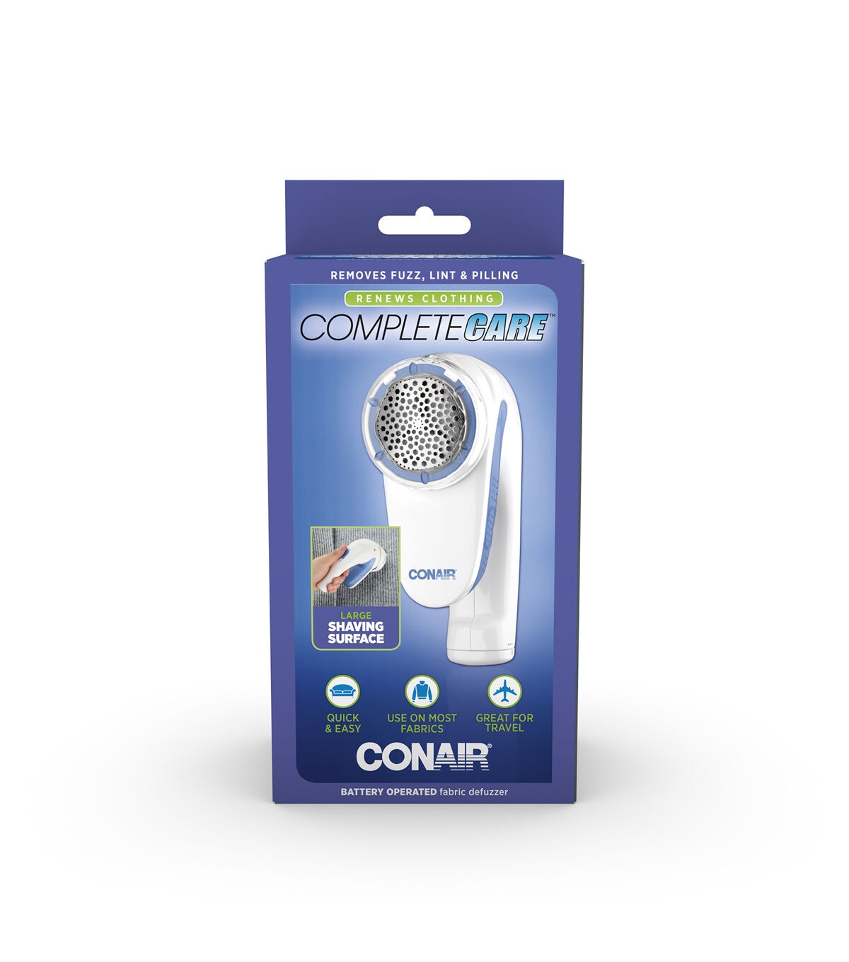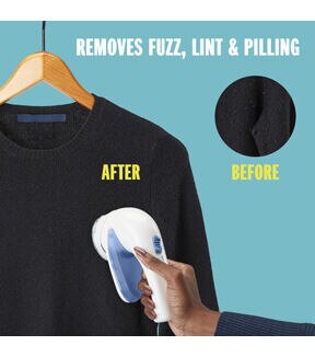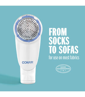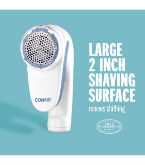 Keep fabrics and clothes feeling and looking like new with the Conair Battery Operated Fabric Defuzzer - White. It evenly shaves fuzz and pill off clothes without causing any damage. This fabric defuzzer is easy to use and comes with a round shaving head and a comfortable grip handle. You can use this fabric defuzzer designed with adjustable distance control to suit different fabric surfaces and a detachable collection compartment for easy cleaning.