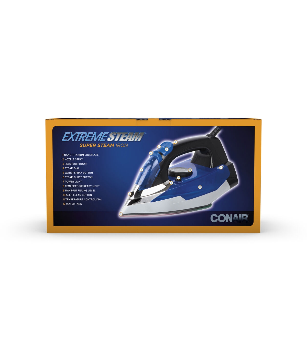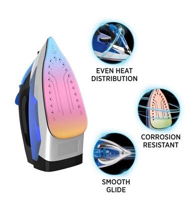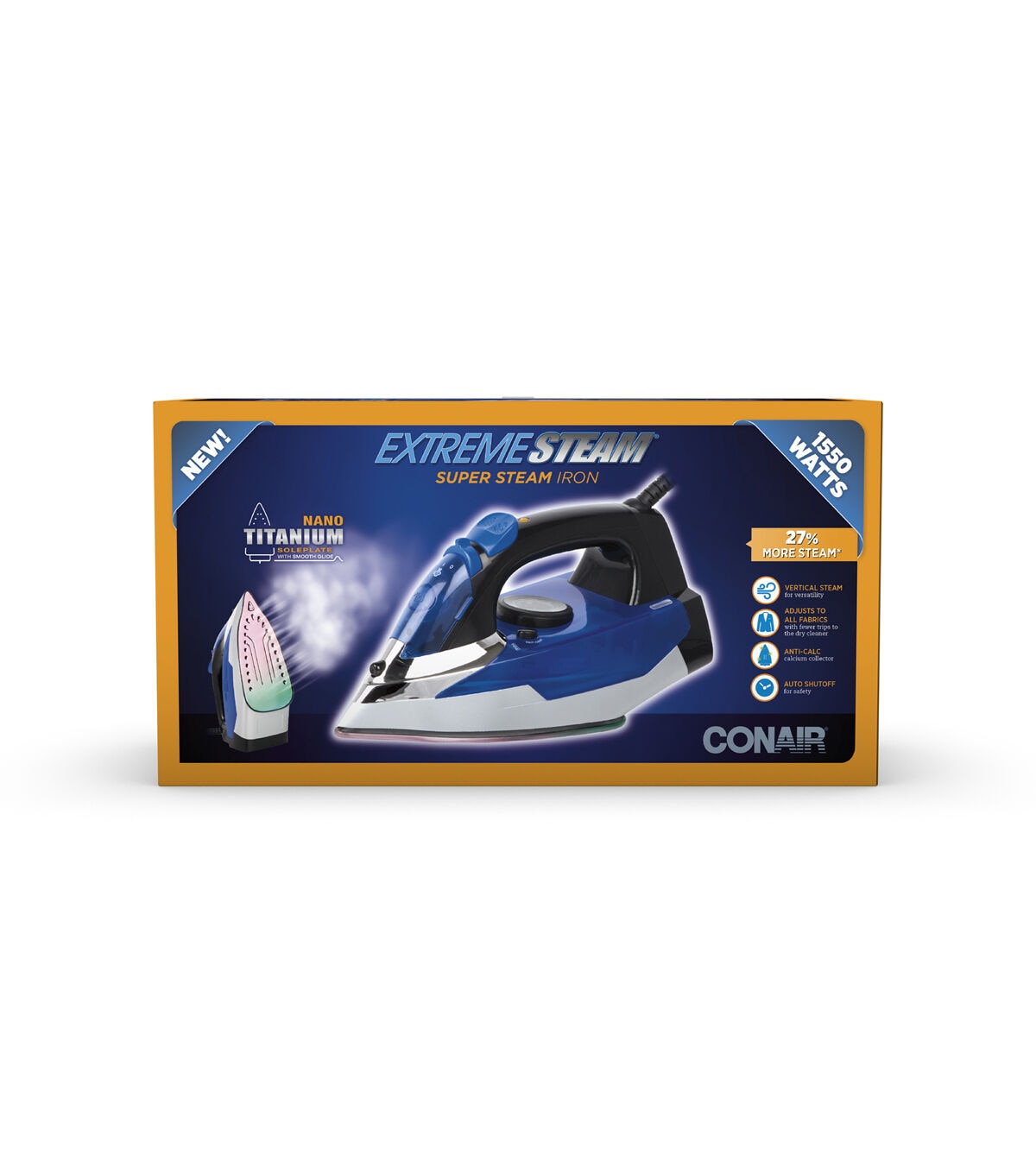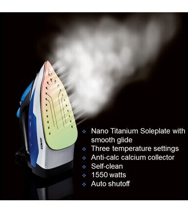 The Conair ExtremeSteam Super Steam Iron comes with a nano titanium soleplate. With 1550 watts of extreme power, this iron has three temperature settings catering to all fabrics. Its steam rate is approximately 20 grams per minute. It features anti-calc, vertical steam, self-clean and anti-drip functions. Its ultra quick heat up time is 42 seconds.