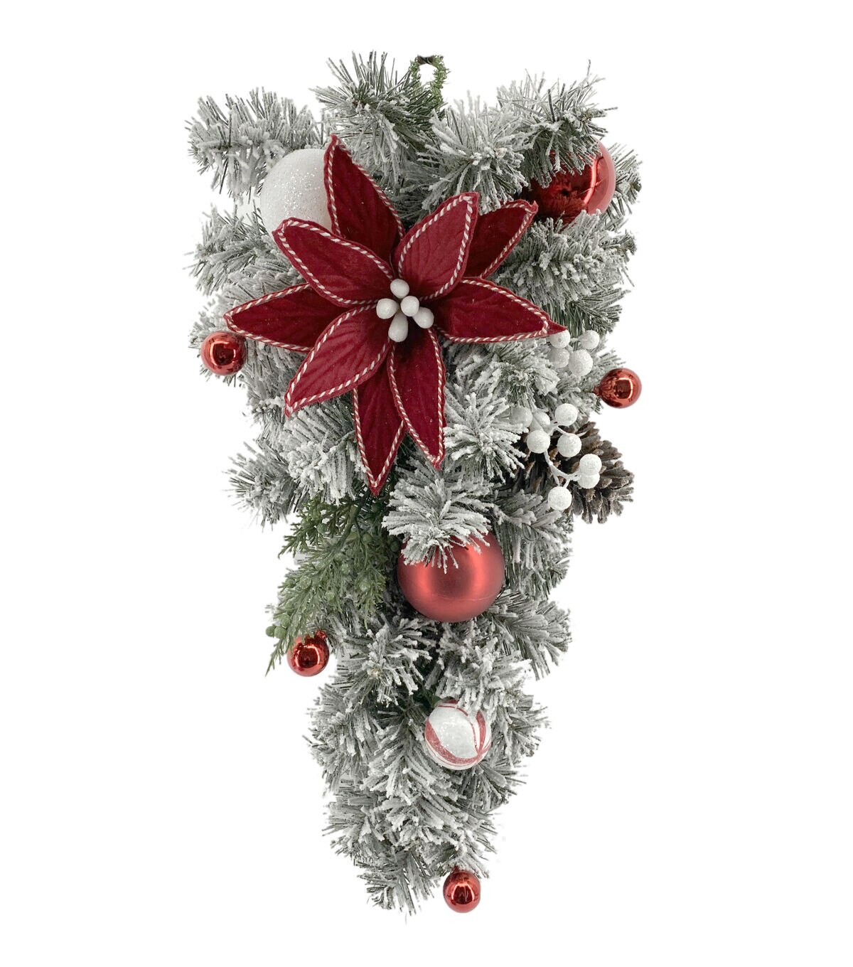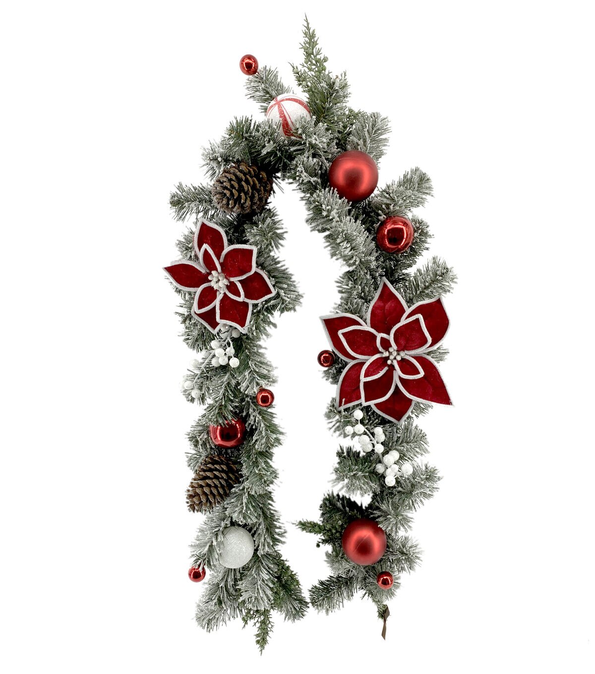 Set the vibes right for your upcoming Christmas party by decorating your home with the Christmas Red Poinsettia & Flocked Pine Wreath, Garland, Swag, and Teardrop by Bloom Room. All pieces are made of artificial poinsettias, baubles in red and white hues, pinecones and flocked pine needles. Place these pieces above the mantelshelf teamed with string lights to create an illuminated display.