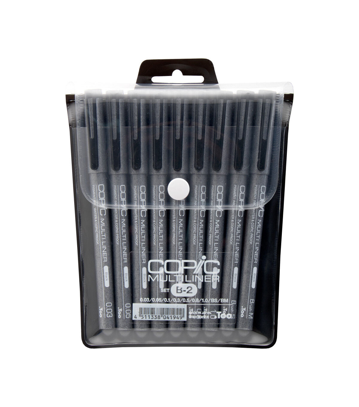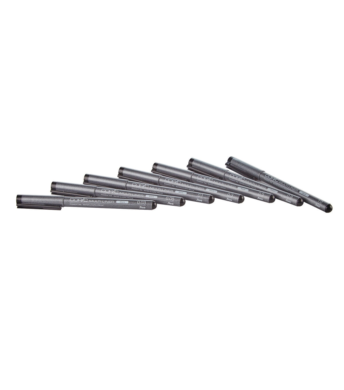 The popular original Multiliner inking pens are ideal for all of your fine-inking needs.Multiliners are permanent, waterproof pigment pens that will not bleed into Copic markers. These precision drawing pens are great for detailing, fine art, design, comics, illustrations, modeling, journaling, papercrafting and more. Set contents include 0.03 mm pen, 0.05 mm pen, 0.1 mm pen, 0.3 mm pen, 0.5mm pen, 0.8 mm pen, 1.0 mm pen, Brush small pen, Brush medium pen. Pigment-based ink, Waterproof and archival, Disposable , Compatible with Copic markers, Photocopy safe