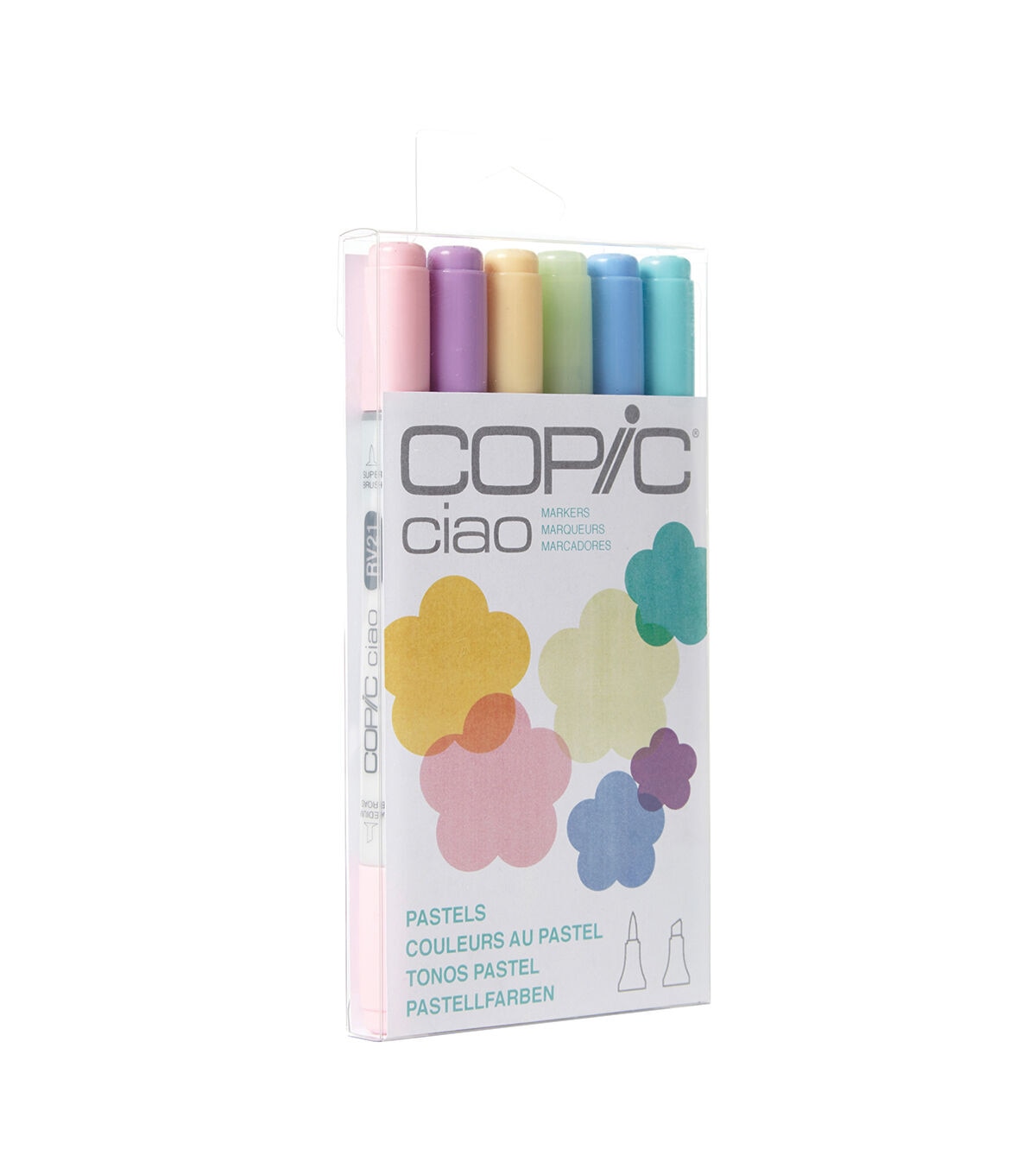 This set features a set of six Copic® Ciao markers in a variety of pastel colors. These versatile double-ended refillable markers are fast-drying, permanent and non-toxic. Ideal for calligraphy, airbrushing and graphic arts applications, this marker features a broad tip on one end offering smooth, consistent coverage for large areas, while the fine tip on the other end allows for easy detail work.