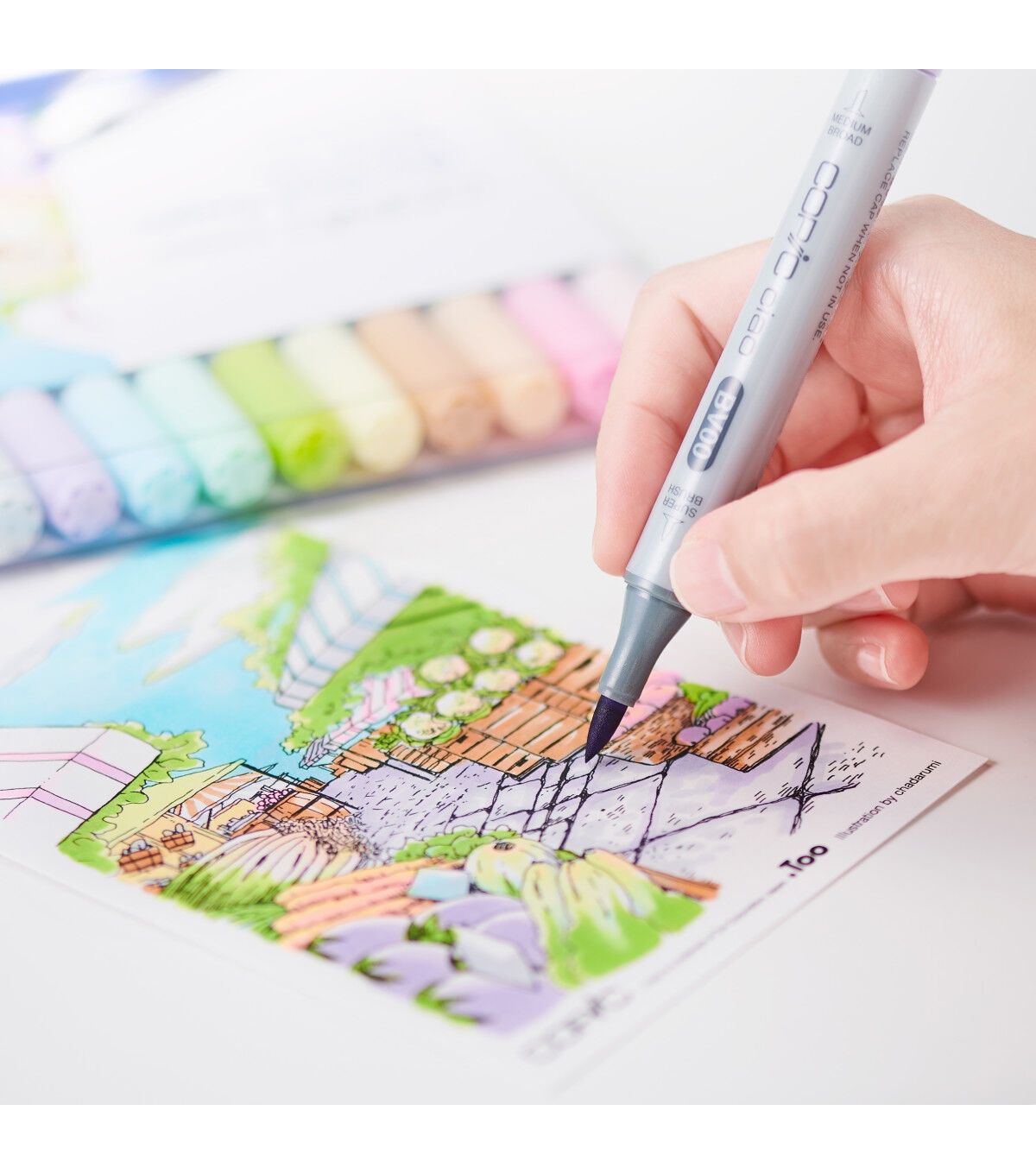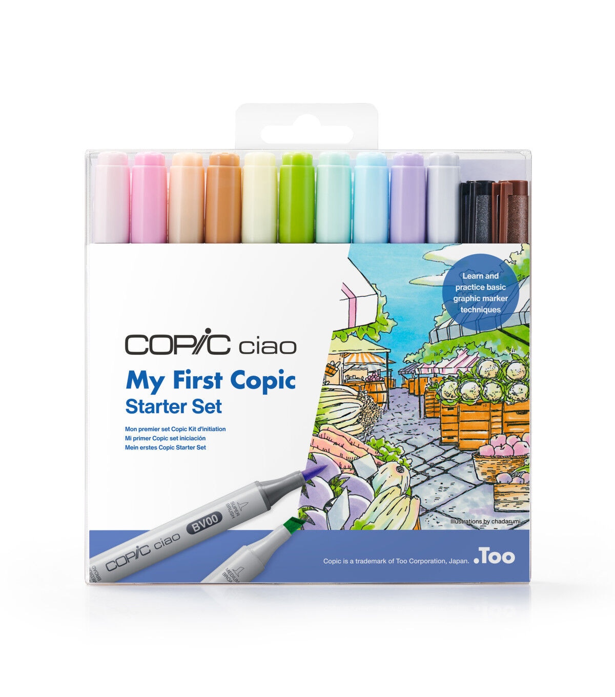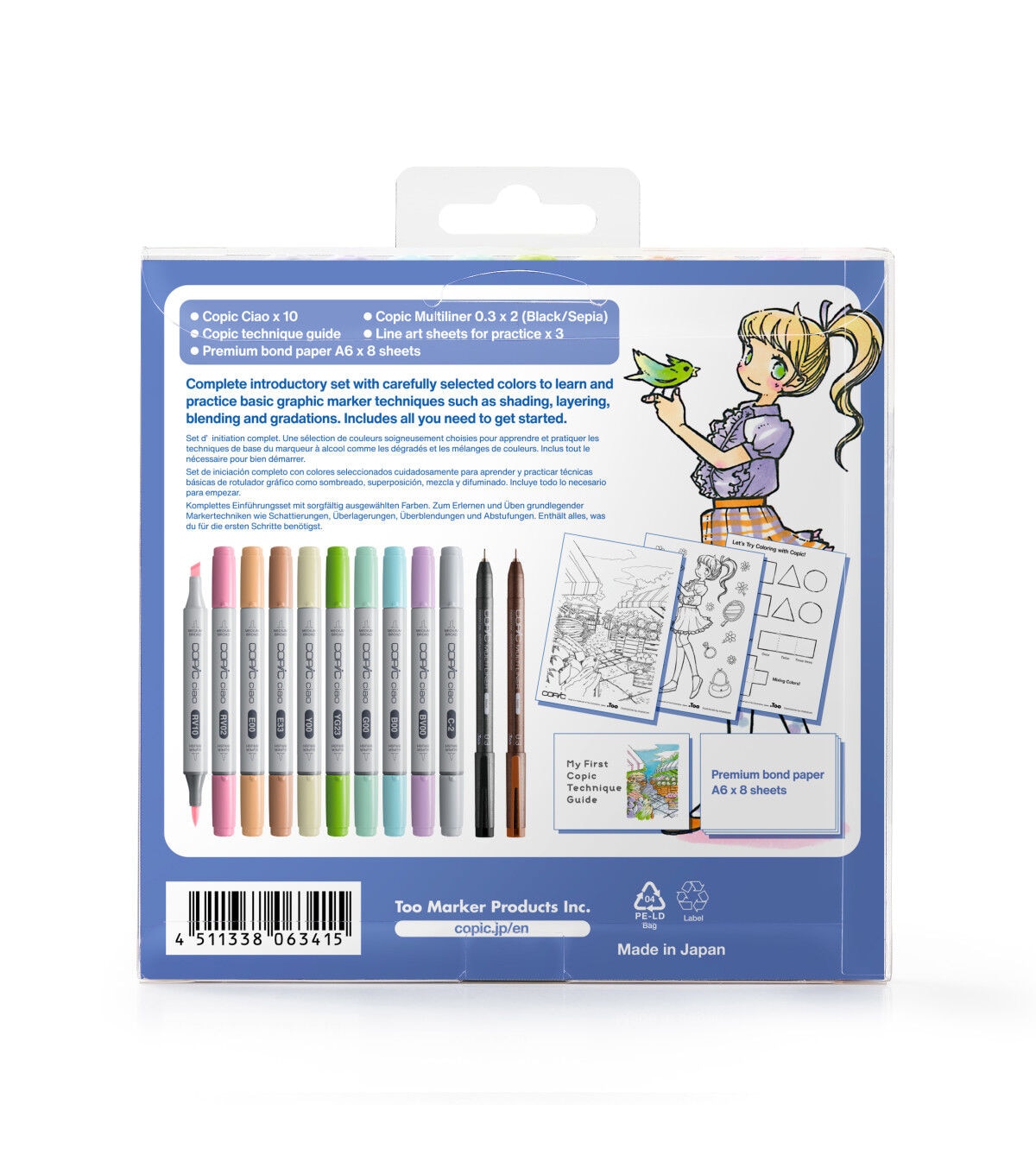 This starter set includes ten COPIC Ciao markers in light tone colors, black and sepia Multiliner pens, a tutorial page, line art practice sheets, and premium bond paper sheets. The set contains one each of Ciao markers in mauve shadow, sugared almond pink, pale pink, barium yellow, new leaf, jade green, frost blue, cotton pearl, sand, and cool gray 2, and one each of .3mm Multiliner Pens in black and sepia.