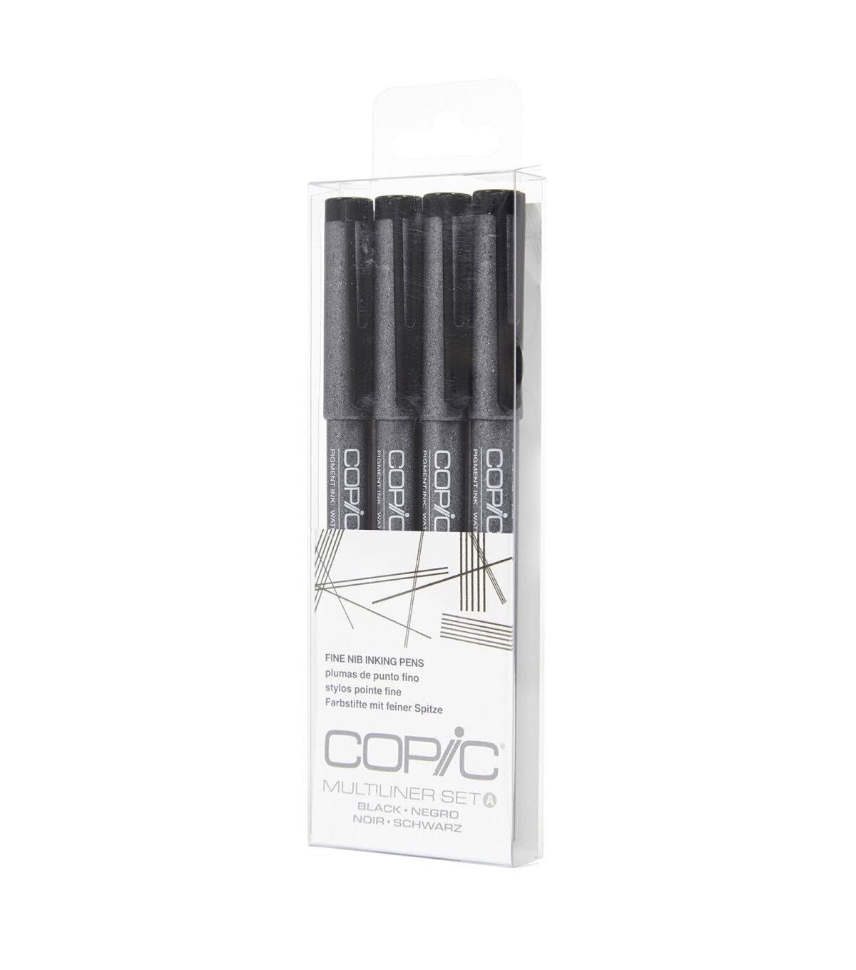 This set of four black pigment-based ink pens is great for details, fine art, design, comics, modeling, journaling and papercrafting. This set includes a variety of fine tips: 0.03mm, 0.05mm, 0.1mm and 0.3mm.