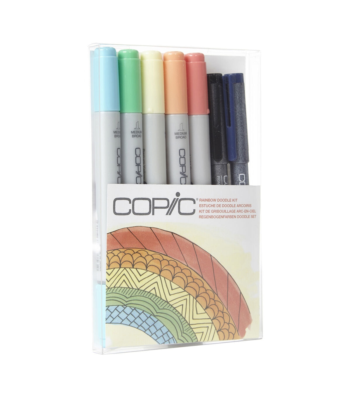 Doodle Kits make drawing more fun! This Rainbow kit features everything you need, with five colorful Ciao markers and two mutiliner pens. The markers are versatile double-ended refillable markers with fast-drying, permanent and non-toxic ink. The multiliners are permanent, waterproof pigment pens that will not bleed into Copic® Markers.